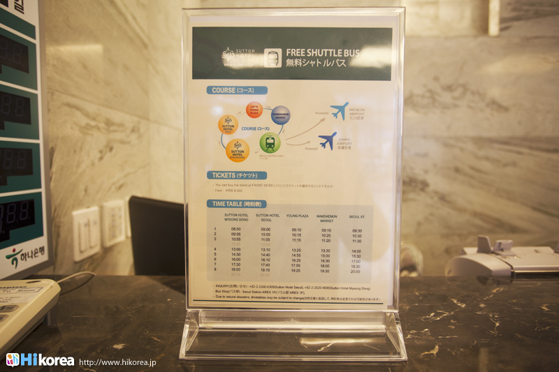 <乗車> ・ホテル:ホテル前 ・ソウル駅:空港鉄道A’REXソウル駅4番出口近くのシャトルバス乗り場 <運行ルート(循環バス)> サットンホテル明洞→サットンホテルソウル→ヤングプラザ(降車のみ)→南大門市場(降車のみ)→ソウル駅→サットンホテル明洞→サットンホテルソウル |