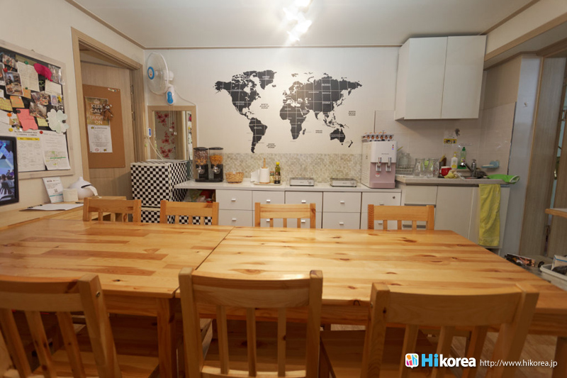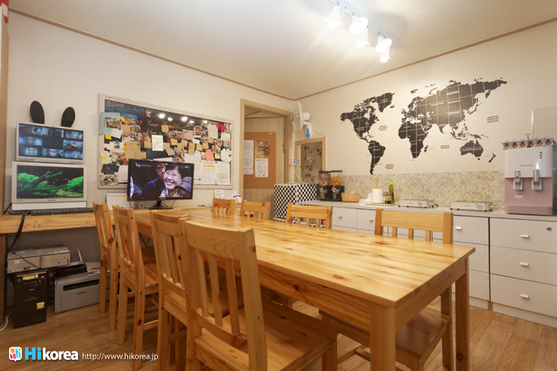 | 梨花女子大がある新村(シンチョン)は近くに弘翼大、延世大など多くの大学が集まっている若者の町として知られている。その新村の地下鉄2号線梨大駅から徒歩2分の所に位置する「24ゲストハウス梨大店」はソウル市内になん店舗もある24ゲストハウスのナなのひとつ。女子大の前に位置するだけあって近くにはデザートの美味しいカフェや可愛い雑貨屋、韓国人の国民のおやつとも言えるトッポキ屋さんなどなどグルメにショッピングに最適の立地です。また、仁川空港や金浦空港からのリムジンバス停留所も近くにあり空港からのアクセスも便利です。女性専用のドミトリ部屋もありリーズナブルに宿泊したい方にはもってこいです。24ゲストハウス系列のイエロー色をベースにしたインテリアで暖かな空間を作っています。 |