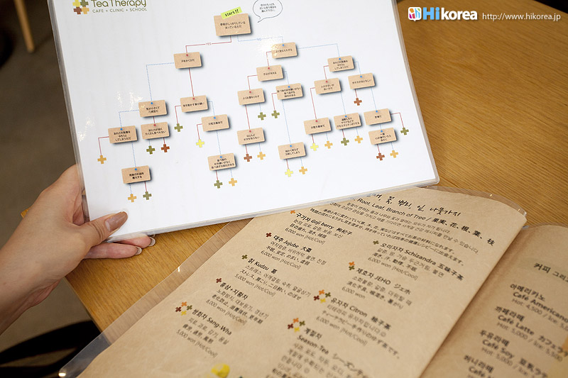 みなさん、アンニョンハセヨ☆いかがお過ごしですか(。◕ ω ◕。) さて、今回はセレブの街といわれる“狎鴎亭”に位置するお店をご紹介いたします。ここ『Tea Therapy』は自分の体に関すること、美容・健康などを考える時間を提供してくれる癒しのカフェなんだそうですが、自分でも知らなかった体質を暴き、それにあったお茶をその場で作ってくれるというカフェなんです。小さなストレス、小さな悩みなどがコツコツと溜まっている現代人の体には、それに伴う体の不調があります。自分でも気付かなかったり、お医者さんに相談しても病気ではなかったり・・・そんな病気予備軍をここで見つけて退治!心をリラックスさせてストレスを追い払う!そんな、理想的なことが叶うカフェなんですよ。日本人観光客もかなり注目しているらしいこのカフェ、一体中はどーなってるの!?早速お邪魔して見ましょう!観光スポットとしても人気急上昇中!“狎鴎亭”にある『Tea Therapy』『Tea Therapy』とは、どんなコンセプトのお店なの!?あなたにはどんなお茶?『ナマネ チャ ~私だけのお茶~』 こちらのお店の代表メニューは『ナマネ チャ』。韓国語で『나만의 차』と書き、“私だけのお茶”という意味です。その名前の通り、私だけのお茶をこちらでお召し上がりいただけるのですが、一体どうやって私だけのお茶を作るの!?と疑問に思いますよね。実はこのお店のオーナーは韓方医学を勉強し、実際韓方医院で患者さんを見ていたこともある、正真正銘の韓方医の先生。元々韓方薬は値段がちょっと高く、保険が利かない。。。なんて事もあり、患者さんは年配の方がほとんどだったそうです。でも、なんとか若い方たちにも韓方の良さを知ってもらいたい!という事で、気軽に立ち寄れるカフェを思いつき、韓方カフェとしてオープンしたそうなんです。そこで考えたのが『ナマネ チャ』。実際に韓方医の先生に診断して頂き、その場で体の悪い部分を暴いていきます。そして、それに効くお茶をその場で選び作ってくれる、まさに“私だけのお茶”が完成するのです。やり方は簡単で、メニューにその手順が細かく載っています。日本語で書かれていますし、先生からの診断も店員さんが日本語に訳して教えてくれますので安心です。もちろん苦手な味や、こういう味のお茶が飲みたい!という希望があれば快く聞いてくれます。あなたが心から癒されるように最善のお茶を作ってくれるんです。