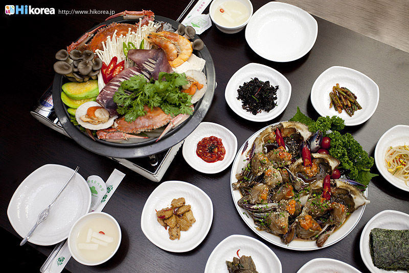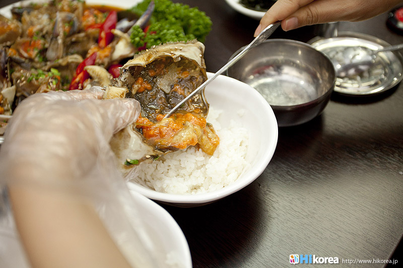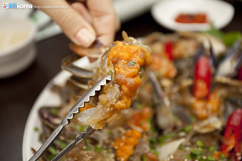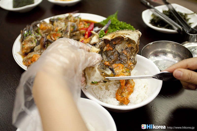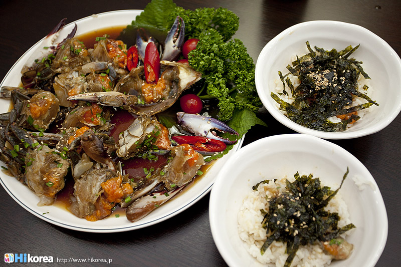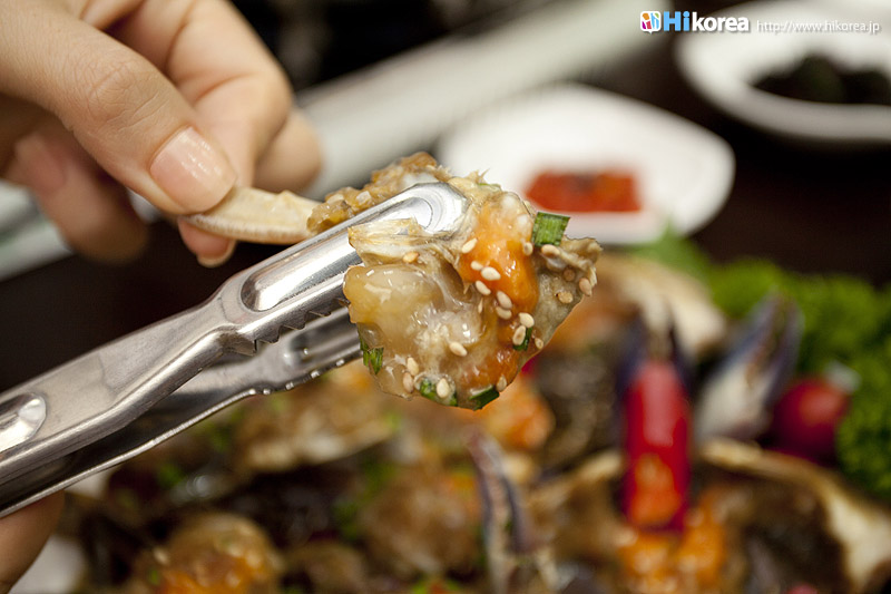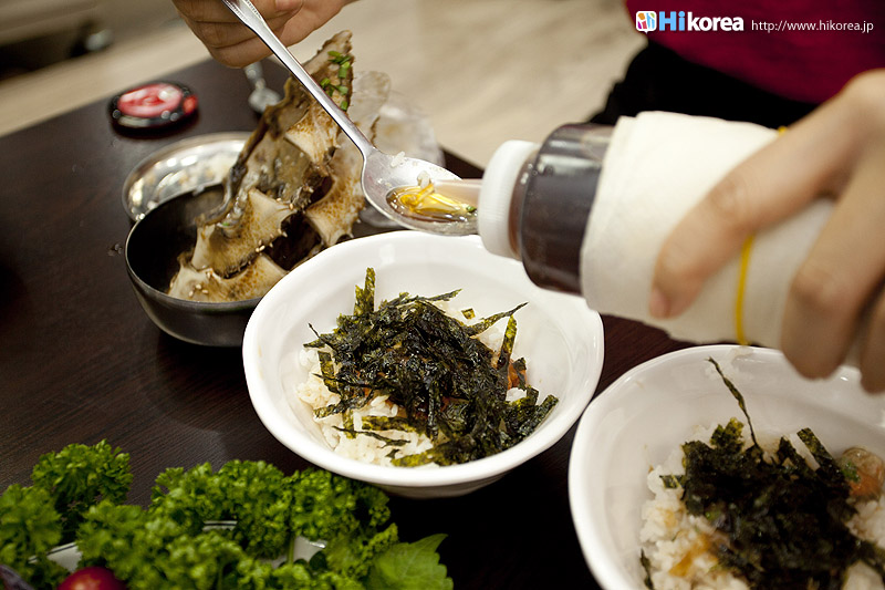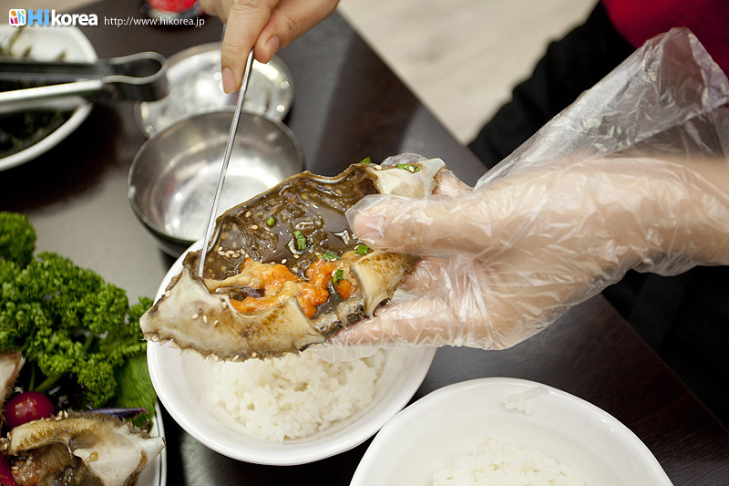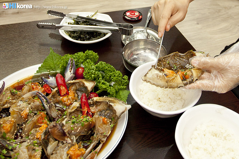プルルンとしたカニの身と、色鮮やかなオレンジ色の卵がツヤツヤしていて、たまらない食感です。しょっぱすぎず生臭さも一切無く、奥深い風味や香りが口の中全体に広がります。食べ方は、足の部分を持って胴の部分にかぶりつき、チューチュー吸い出して食べるのが通!カニ本来の甘みや特性醤油の香ばしさがたまらない美味しさです。お酒のつまみにもピッタリなので、焼酎やビールと一緒に召し上がってみてもいいですね。 お楽しみはこれだけじゃない!これが本当の“ご飯泥棒” これがあるからカンジャンケジャンを食べる人もいる位、美味しい食べ方です。こちらのお店では店員さんが全部やってくれるので、安心&楽チンですよね! まずご飯を用意 甲羅にある味噌をかき集めます 奥からもかき出してご飯にのせて 特性醤油をスプーン2~3杯 あぶり刻み海苔をのせ ごま油をスプーン2~3杯 ジャン! まぜまぜまぜ・・・ コチュジャンと海苔でどうぞ 人気メニューのコッケタン(ワタリガニの鍋)こちらのお鍋はワタリガニの他に海の幸をふんだんに使ったお鍋です。野菜やキノコも溢れんばかりに入っています。あまり辛くないのでお子さんにも喜んでもらえる味だと思いますよ!ここに入ってるカニにも味噌がタップリ詰まっているのでこちらもお楽しみ下さい。 大きい具は店員さんが切ってくれます バリバリ・・・ グツグツ煮えたら召し上がれ お楽しみメニュー沢山(*´∀`*)“ヤンニョムケジャン” こちらは唐辛子やニンニク、しょうが、ネギ、砂糖店によっては蜂蜜などを混ぜた真っ赤なソースに漬けたワタリガニです。食べ方はカニの身をチューチュー吸ったり、ガリガリ噛んで殻だけ出したりと、お好きな様に食べていただけます。 “生タコのお刺身” 生きたままブツ切りにされたタコのお刺身です。お皿の上でウネウネと動いている新鮮なタコを、特性のタレにつけて食べます。箸から落ちないようにしっかりつかんで下さいね! “海鮮チヂミ” 韓国料理の中でも人気のチヂミ!自慢の海鮮を沢山使い、ネギの香ばしさが最高の一品。専用タレも病みつきの旨さでした。色鮮やかでキレイでしょ! “ケランチム(韓国風茶碗蒸し)” こちらの品は定食の時はついてくるそうです。単品注文の際は5000ウォンで提供しています。日本の茶碗蒸しとは全く違うので、是非食べてみて下さい! “お粥” 韓国にはたくさんの種類のお粥がありますが、こちらでもお召し上がり頂けます。朝食メニューもやってますので、朝ご飯や、食べすぎて胃が疲れちゃった日などにおすすめです。 アワビ粥 ![]() カニ肉粥 グルメに舌鼓したいあなた! |