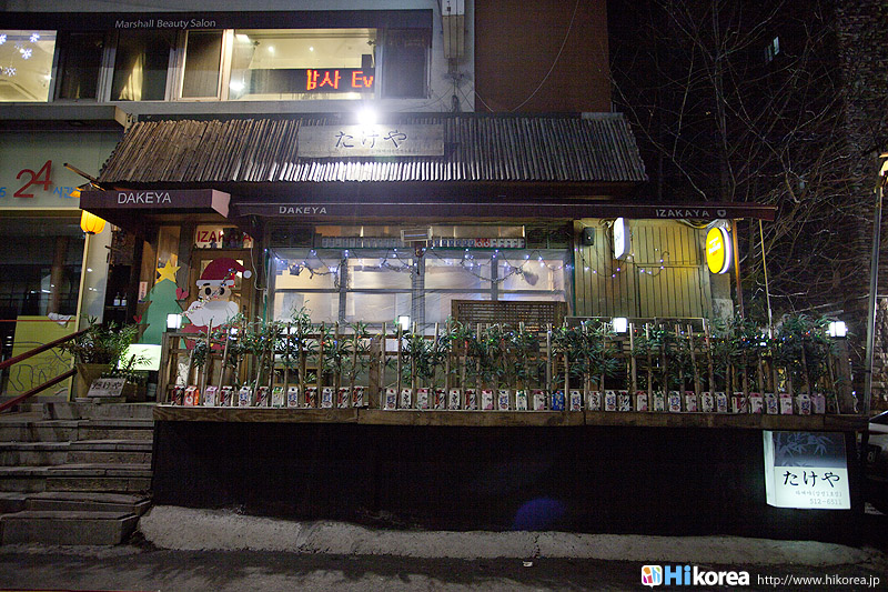 『たけや』のオーナーは、スター達といっしょにステージに立つことの多いダンサーとしても活躍中で、オーナーを慕って足繁くK-POPスター達が通う、今ソウルで人気の日本風居酒屋です。そして、なんといっても『たけや』のオーナーは超イケメン!K-POスターに会えなくたって、ここのオーナーに会いに行くだけでも価値ありです。またオーナーは大の日本好きとあって、お店の中の雰囲気はまるで日本。ご自身も日本へ度々足を運び、その度に居酒屋へ行き勉強されてくるそうです。料理も日本風のものが多く、腕のいい料理長さんがおいし~く作ってくれます。日々新メニューの開発もしているので、料理に愛情を注いでいるのが良くわかります。現在移転中! |