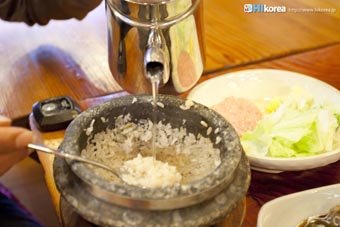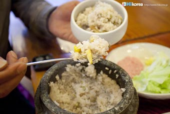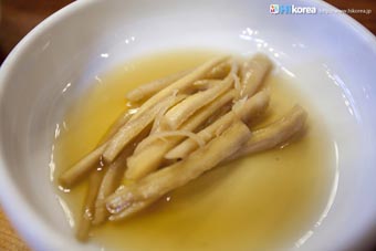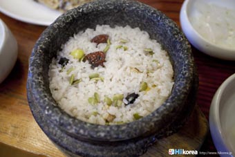 韓国伝統家屋で王様のお膳に上ったご飯を食べてみよう!ここ『正一品』のサルバッ(米飯)定食は、22種類のおかずと韓国かぼちゃの種、銀杏、くるみ、黒豆、なつめ、栗を入れて石釜の鍋で炊き上げたご飯が付いてきます。このご飯は味は付いてないのですが、各々の素材が持ってる持ち味を十分に引き出しているので、おかずが無くても十分おいしくいただけます。が、おかずも充実していて、自己主張し過ぎない優しい味となっているので、石釜ごはんをおいしく食べることができます。じゃあ、ちょっと物足りないんではと思われる方もいらっしゃるかもしれませんが、心配御無用!カルビ焼きあり、焼き魚あり、煮魚あり、その上わたりがにのしょうゆ漬けまで付いてくるので、もうお腹はパンパンになってしまいます。それでは、『正一品』おかずの面々をご紹介しましょう。 チャプチェ わたりがにのしょうゆ漬け セサと言う葉(日本にはないですね) キムチ カルビの鉄板焼き トラジのしょうゆ漬け トドリムッ(どんぐりの寒天) とうがらしの葉 白キムチ しいたけの煮物 さんまの塩焼き チジミ わかめの酢の物 もやしの和え物 春菊の白和え いしもちの煮物 おからのチゲ サンジャン 石釜ごはん テンジャンチゲ サンチュ(チシャ菜) 日本人から人気の“栄養石焼定食”を・・・いかがでしたか?利川はソウルからも近いので、焼き物好きのグルメさんには、もってこいの場所ですね。『正一品』の一番人気のメニューは韓国人と日本人とは違うそうで、韓国人には“利川石釜飯定食”で、日本人には“栄養石釜定食”が人気だそうです。利川を訪れる際は、一度立ち寄ってみては、いかがでしょう。 作成日 2011,10,27 |