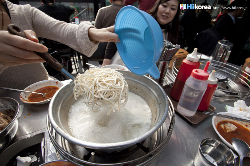 ンマリ。日本人だけではなく、他の外国人の方からも人気です。東大門市場にあり!!東大門でショッピングをしてお腹が空いたらぜひぜひ、「東大門タッハンマリ通り」に行かなきゃ損!!数々のタッハンマリが立ち並ぶ激戦区でも「チンオックァハルメ元祖タッハンマリ」はいつも人で大繁盛。1階から3階まであり、1階はテラス席もあります。300席ほどあるので団体利用も可能ですよ。日本人のお客さんもたくさん見かけましたよ!! 入口には日本語も。わかりやすいですね ![]() お昼でもこの混みよう メニューは以外にシンプル タッハンマリの美味しい食べ方タッハンマリ 一羽(2~3人前) 18,000ウォン 本当にダイナミックなその姿にビックリする方も多いはず。 鍋の中には鶏肉の他にネギ、トッポキと呼ばれる韓国風のお餅、ジャガイモが入ってきます。※トッポキは別途かかります。 つけたれソースを作ろう!! 好みに合わせて作ります。辛目が好きな方は唐辛子を入れて。それぞれ違うソースが完成!! 辛さの調整はこの唐辛子で 特製のタレ お酢や辛しで味を調整して お店の人がハサミで切ってくれます。 モモ肉、胸肉と別々に スープがよく煮立ってきたらトッポキを タレにつけて「頂きます!!」 スープが煮立って鶏肉のダシが出てきたら最初にお餅から食べます。日本のお餅とは違い、ツルツルとした表面にモチモチの食感で、本当にお餅かと思う程柔らかいのが特徴。鶏一匹なので、手羽、腿肉、胸肉と色々な部位が食べられて飽きることが無く、コラーゲンたっぷりのダシ汁で煮込んであるので、滋養強壮にも美容にも良いんです。美味しい物を食べて、綺麗になれるなんて嬉しいですね! <お水やキムチはセルフサービス/span> キムチは食べ放題 タレが飛ぶのでエプロンをかけて 第二弾の食べ方も忘れてはいけません!! |