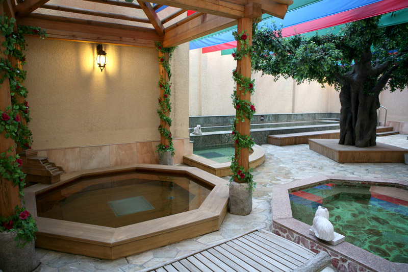 ここは外国人のお客さんも沢山来るんで、ピザやチキンなどのお店も充実。こちらは“インディアンバーベキュー村”というお店でビールやおつまみ類も沢山あります。こちらのお店から屋上ガーデンに繋がっていますので、空を見ながら爽やかなビールも良いですね。 広いお風呂で疲れを取りましょう。