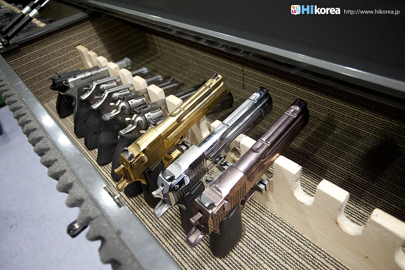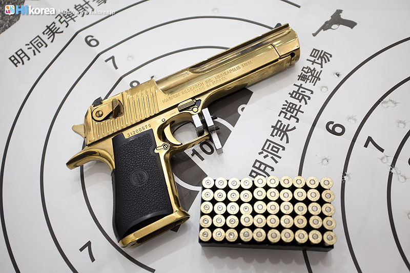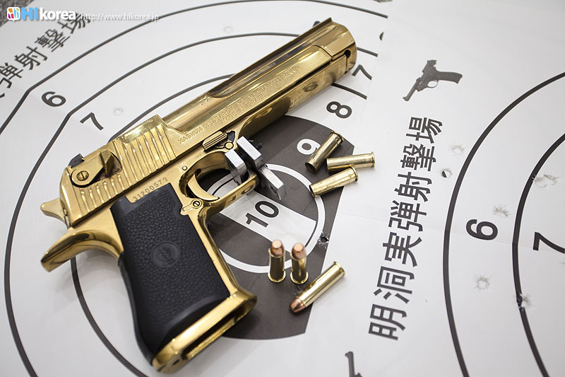 実際に射撃に挑戦!『明洞射撃場』で働くスタッフの方は、皆日本語がお上手な方ばかり。お店に入るとすぐ席に案内してくれ、メニューや銃の説明をしてくれます。銃は約20種類程あり人気の映画の中で使われた銃や、ルパン三世で主役のルパンや峰不二子が使用していた銃など沢山の種類を用意しています。本物の銃に触れることすらまずないですが、ここではその銃を撃てるということで気持ちが高ぶります。コースも色々あり全て丁寧に説明してくれるので、自分に一番合うコースを選びましょう。 実際射台に入ってみると異様な緊張感が漂っています。スタッフの方が銃弾を入れセッティングしてくれるので、指示通りに動きましょう。銃はオモチャのとは全然違い(←当たり前)すごく重たいんです。目線のところまで銃を持ち上げ引き金をひいて・・・バン!!!Σ(゚д゚;) 銃はワイヤーで固定してあり、ある程度動きが取れないようになっているにも関わらず反動がすごい!実際はスタッフの方が背中を抑えててくれますので、後ろに倒れそうになる事はないので心配しないで下さい。そして耳栓のヘッドフォンをしてても聞こえる爆音。打った瞬間風圧と共に来るバン!の音は、一生忘れられない音といった印象でしょうか。とにかく、「本物だー!」っと実感する音でした。ちなみに私が使わせていただいた銃は“H&K P8”という銃。ドイツ製の銃で、アンジェリーナジョリーが映画の中で使用していたものです。 『明洞実弾射撃場』で扱っている銃DESERT EAGLE GOLD 357mag ~デザートイーグルゴールド 357マグナム~(イスラエル) 『明洞実弾射撃場』が所有する銃の中で一番高価な銃のうちのひとつ。本物の金で作られていて、重さもかなりあるものです。マニアの間ではジャム(動作不良)や反動が大きいので、撃ちこなすのは難しいとの声も。