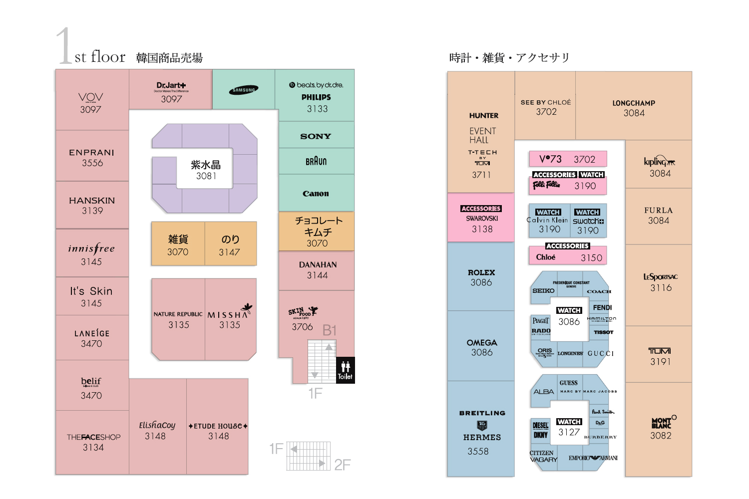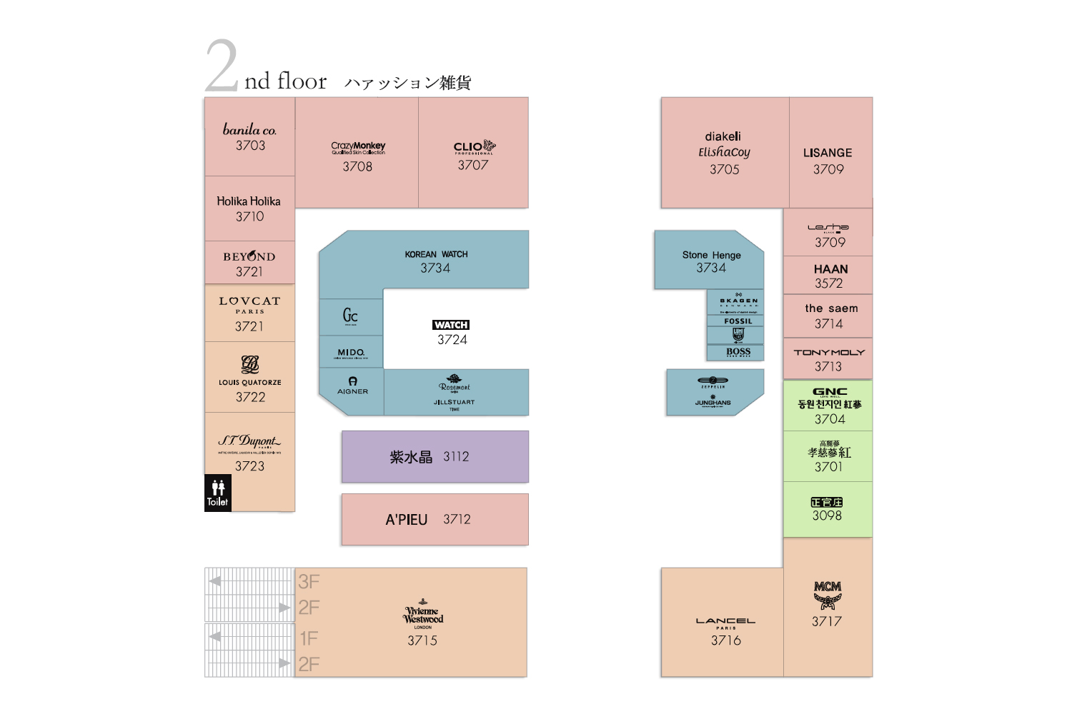 2F(ファッション雑貨、韓国コスメ) 正面左側入り口に入ってすぐのエレベータで上がりますと2階フロアになります。2階は韓国コスメ、海外ブランドのファッション雑貨があります。