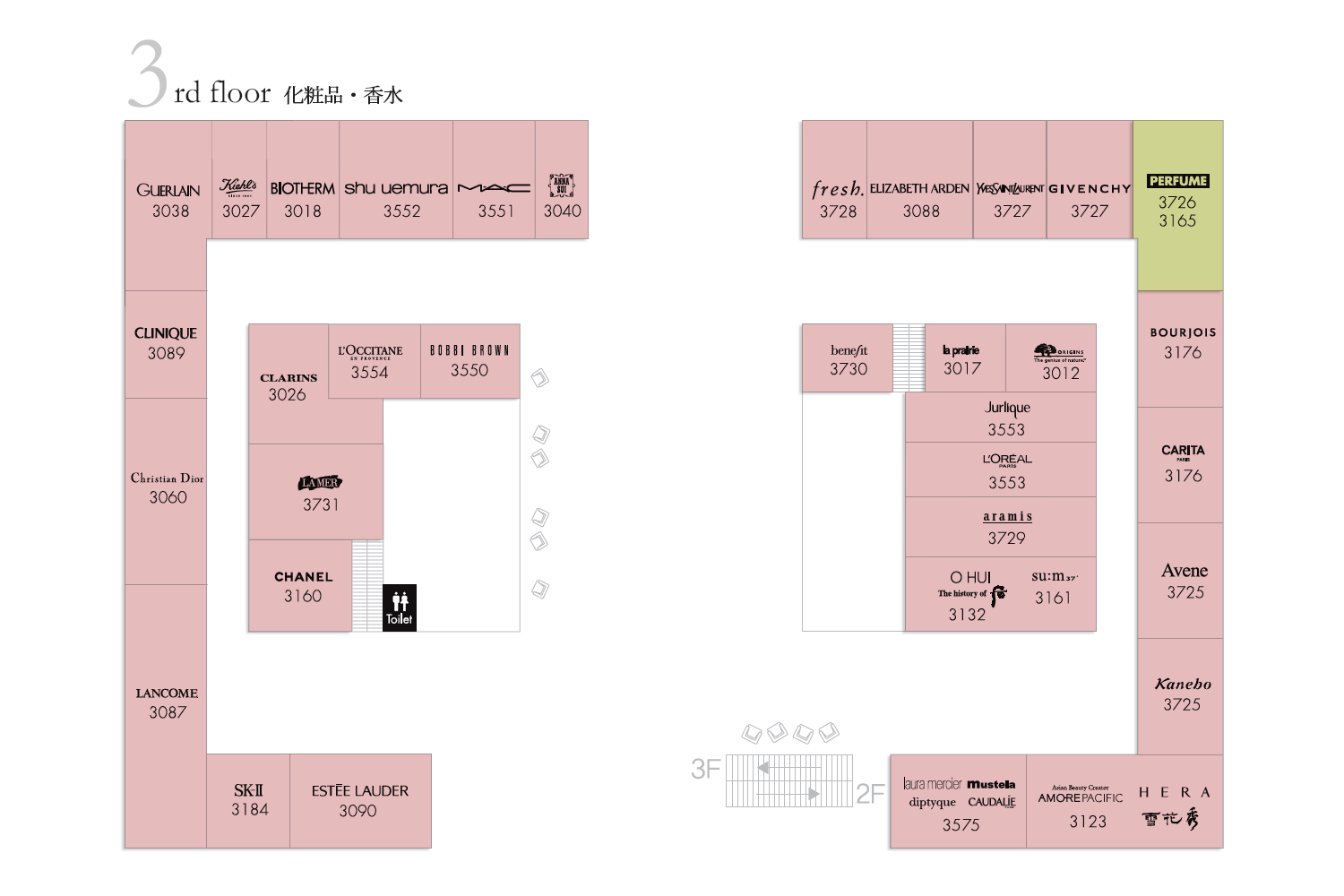 ファッション雑貨ZONE 3F(化粧品、香水) 3階は韓国コスメと海外コスメ、香水の売り場になっております。同じく正面左側の入り口のエスカレータをご利用ください。