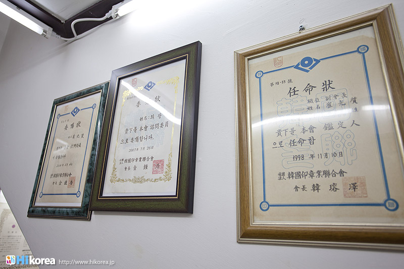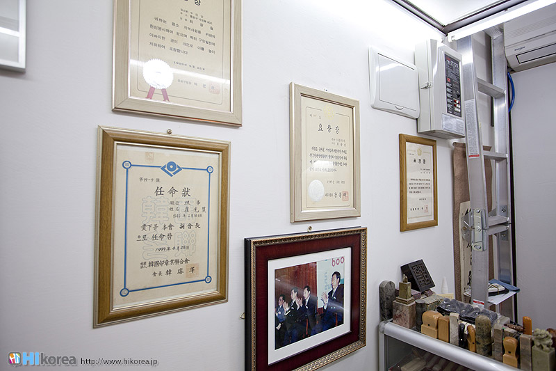 店内に飾られた賞状や写真も沢山。先生はノ・ムヒョン前大統領やイ・ミョンバク大統領、政界人や芸能人の印鑑まで手がけています。