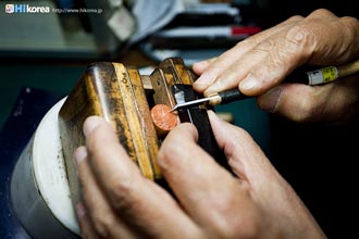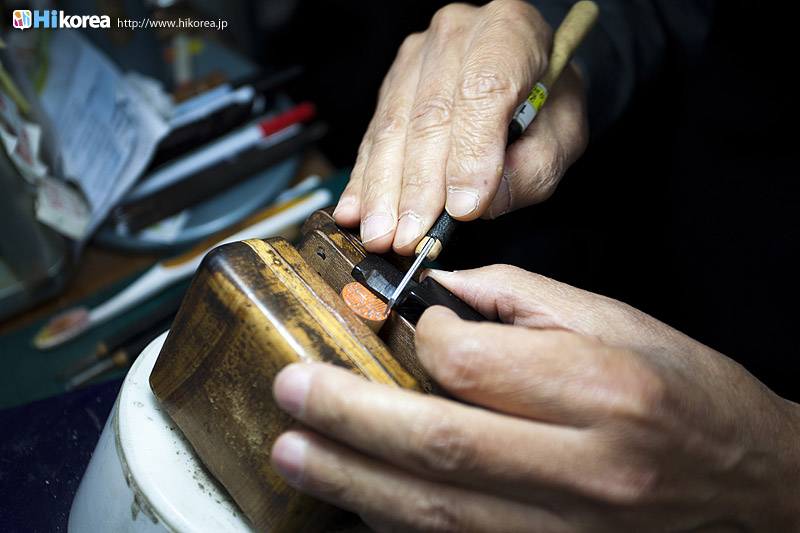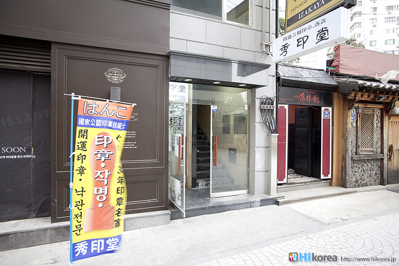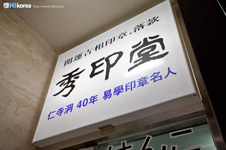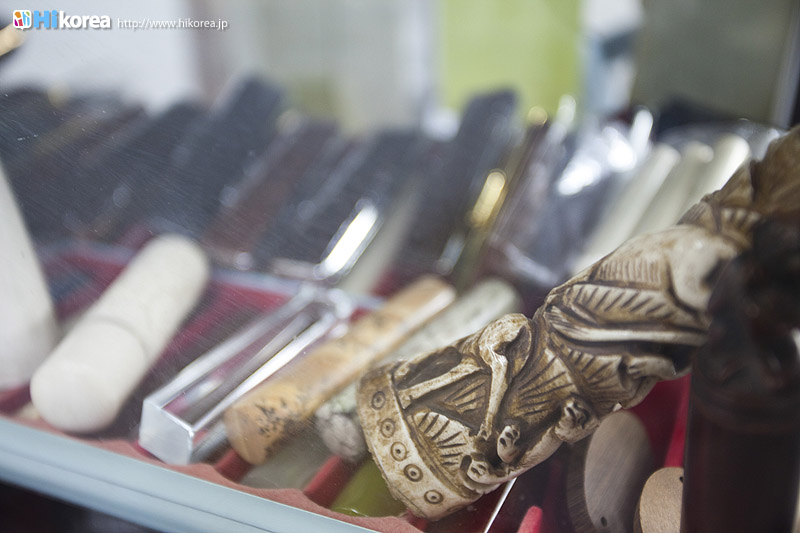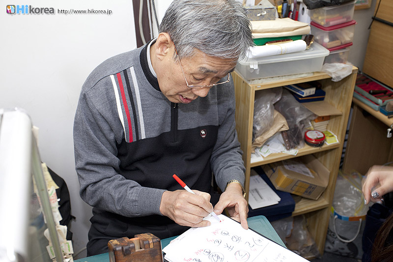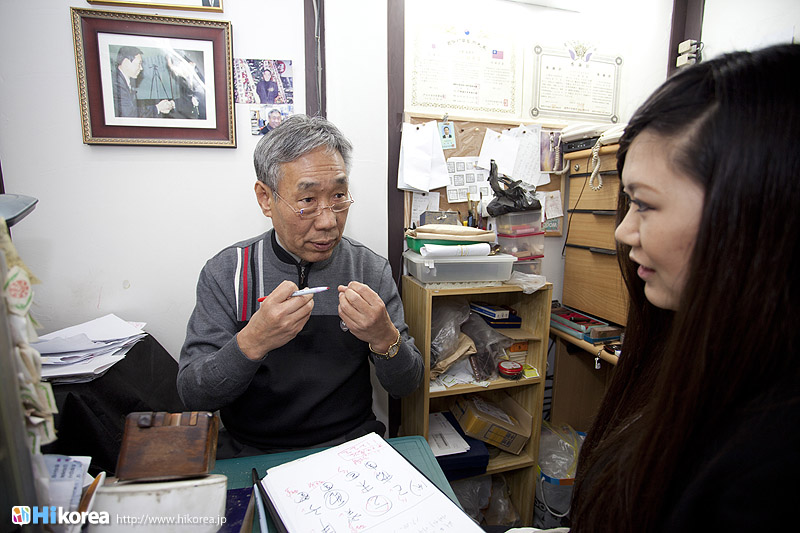 しいんですよ。一体どーなってるの?早速中にお邪魔して見ましょう。伝統茶のカフェや、お土産屋さん、工芸品のお店が沢山!仁寺洞に位置するお店。観光に人気の街、仁寺洞のメイン通りのちょっとした路地に入るとすぐあるこちらのお店。 周りには伝統茶のカフェや、民芸品、工芸品、お土産屋さんなど、韓国ならではの物を取り扱うお店が並んでいます。ハイコリアでもご紹介した『ビーソープ』や『シネッ茶屋』なども近くにありますよ。このお店はこじんまりとしたたたずまいで派手な印象は全く受けません。 パッと見た感じは印象が薄いかも知れませんが、扉を開けてみると先生の深い愛情が出迎えてくれます。中に入った瞬間、人気の秘密が分かる様な気がしますよ(*^-^*) 心温かい人柄、真心をそのまま印鑑に。とても人情深く温かい方で、印鑑作りには職人魂をかけてやってこられたと言う感じの方。 お客様のオーダーに親身になって応じてくれ、真心込めて愛情100%配合の印鑑を作ってくれますよ。それだけでは無く、今では韓国の中でも現役は10人前後と言われている国家公認印章工芸技術の一級の保持者で、韓国印章業連合会の副会長でもある先生。 技術の高さは言わずと知れています。 こじんまりとした小さなお店には収まり切らないほどの人気が溢れています。 より良い印鑑を作る為に、四柱を見てくれます。四柱とは四柱推命占いの事で、生年月日、時間を柱として見る占いです。それによって、その人に合った印鑑の材料、字体、大きさなどをアドバイスしてくれます。その人に足りない運を印鑑に入れたりもするんですよ。勿論無理強いをする訳ではなく、あくまでもアドバイス。お客様の希望を最優先にしてくれるので希望があるがある方は遠慮なくおっしゃって下さい。先生は簡単な日本語しか分かりませんが、コミュニケーションはお手の物ですよ(*・ω・*)
