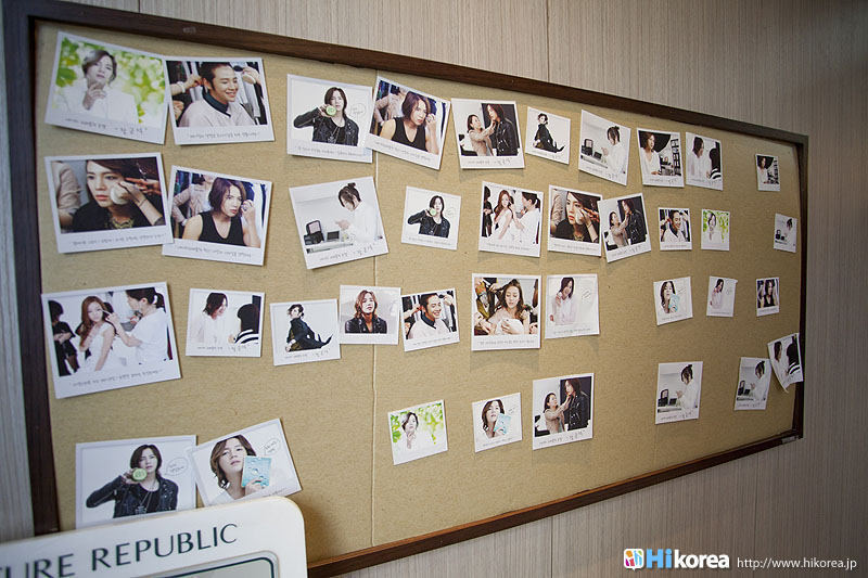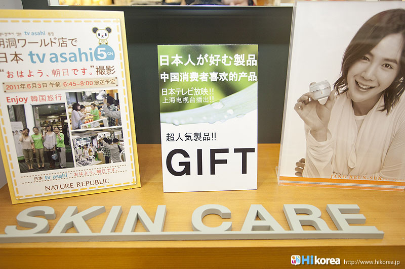 『ネイチャーリパブリック・ワールド店』は最初にも紹介しましたが、1階が一般フロア2階が外国人専用フロアになっています。日本語・中国語・英語のできる店員が常時いますので、いつでも安心してショッピングができ、他店や1階のように混雑していないため、ゆっくりとショッピングすることができます。また、1階フロアと2階フロアの商品は全く同じものが置いてあるので、買い忘れる心配はありません。そして2階にはグンちゃんやKARAの等身大のパネルのあるフォトスポットやコーヒーやお水などの飲める休憩所などがあり、観光で疲れたときにはここで暫し体を休めるのもOK!壁には各国の時刻を示した時計も掛かっています。