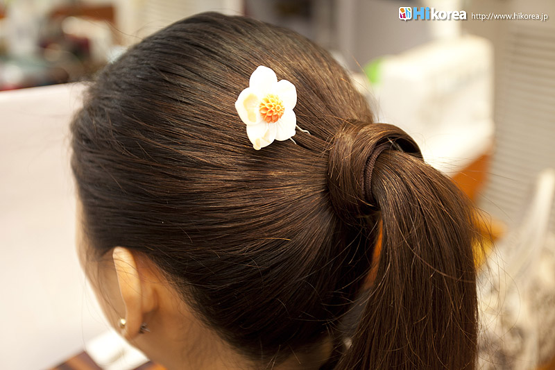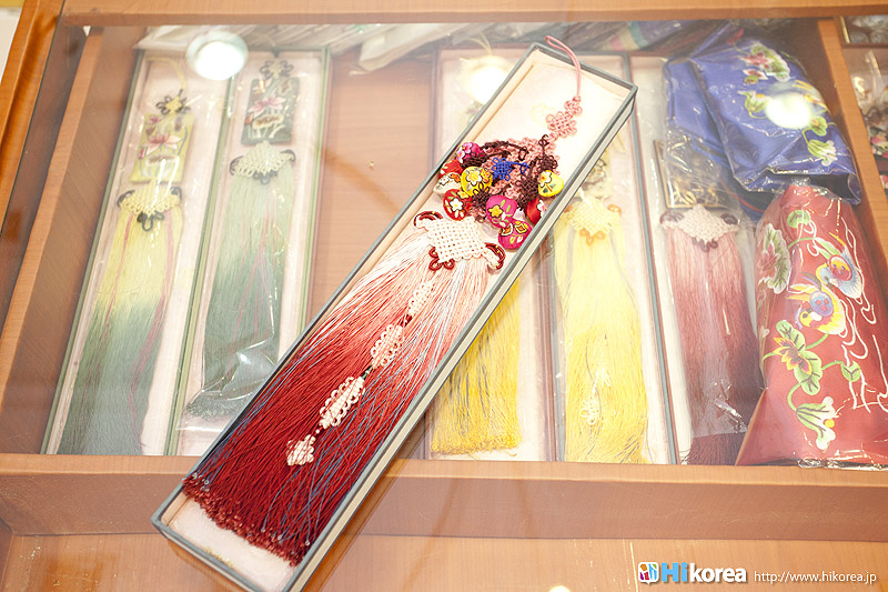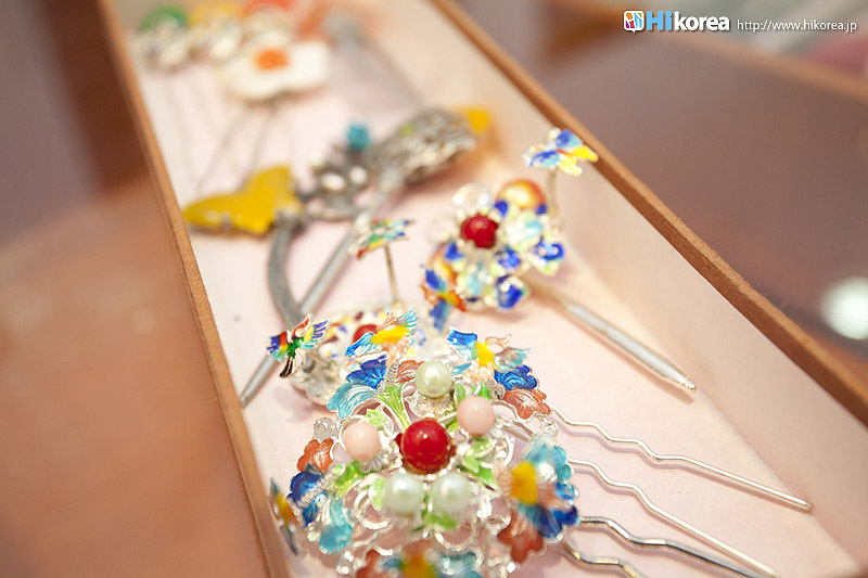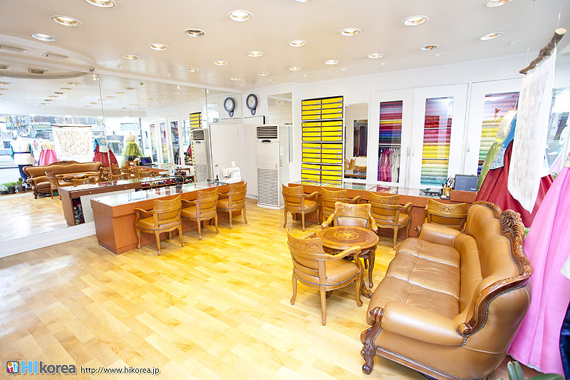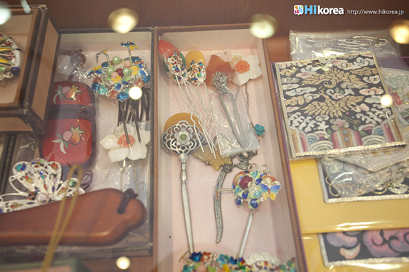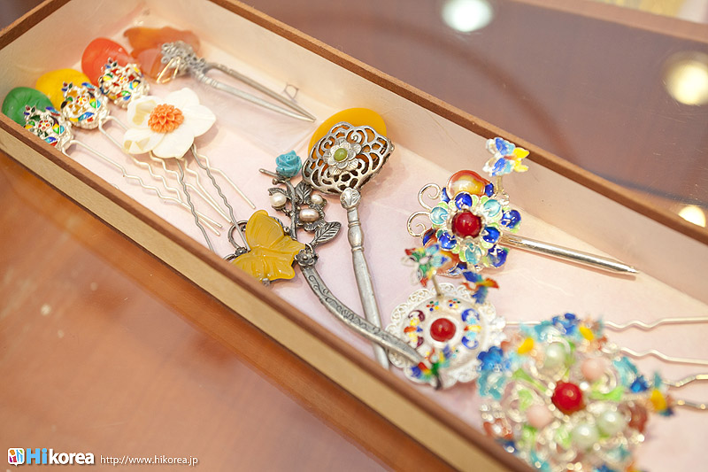 店内は明るい照明で、スッキリしています。相談用の椅子と机に座って、自分が望んでいるチマチョゴリのスタイルを伝えましょう。 カタログやサンプル写真なども見せてくれますので、イメージも伝えやすいと思いますよ。チマチョゴリの“チマ(スカート)”部分は大きいガラスで中が見えるようになっているタンスにキレイに並べられているので、そこからも好みの色やデザインを選んでも良いでしょう。 髪飾り、ノリゲ、指輪などなど・・・小物も沢山流れはこんな感じ。韓国旅行の記念に、あなたも是非。