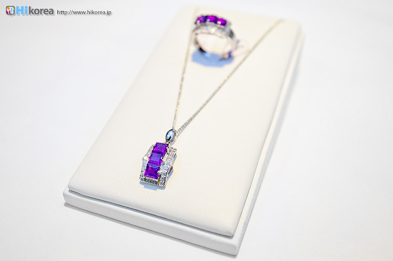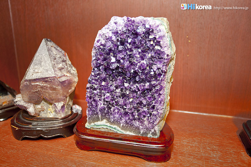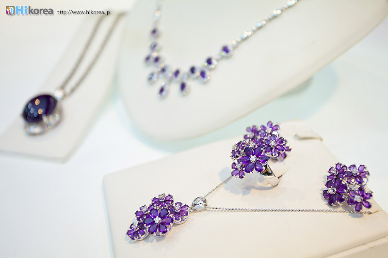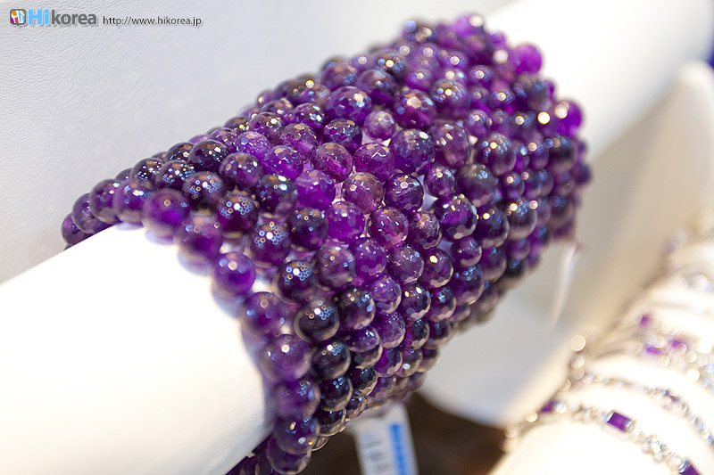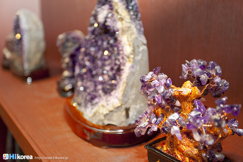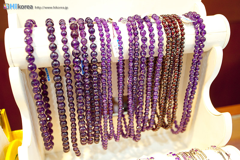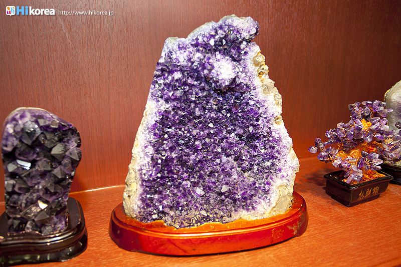 アメジストの世界へどうぞ店内に入店するとさっそく、スタッフの方が日本語で説明をしてくれます。 どの方も日本語が上手でビックリ!!説明が終わったら自由に見学ができます。 さっそく、店内にお邪魔しちゃいましょう~~!! ソウルアメジストの看板 入り口 外国人観光客の方も多い アメジストの不思議なパワー ダイアモンド、ルビー、サファイア、エメラルドと共に世界五大宝石の中の一つである紫水晶は、2月の誕生石として貞操・誠実・平和を意味する宝石言葉を持っています。 紫水晶の代名詞の様に呼ばれる国産水晶は慶南蔚州郡彦陽面が主産地で、国産水晶は彦陽紫水晶と呼称されて世界的に広く知られています。全世界産地ではメキシコ、ブラジル、サンビア、ウルグアイ等があり、国産紫水晶は他産地に比べて、赤い色合いが沢山出て、人気があり、とても高価です。 種類豊富なアメジストの数々ネックレスから指輪まで、男性はネクタイピンを購入する方が多いそう。お値段もリーズナブルなものから高価なものまで幅広く揃っています。