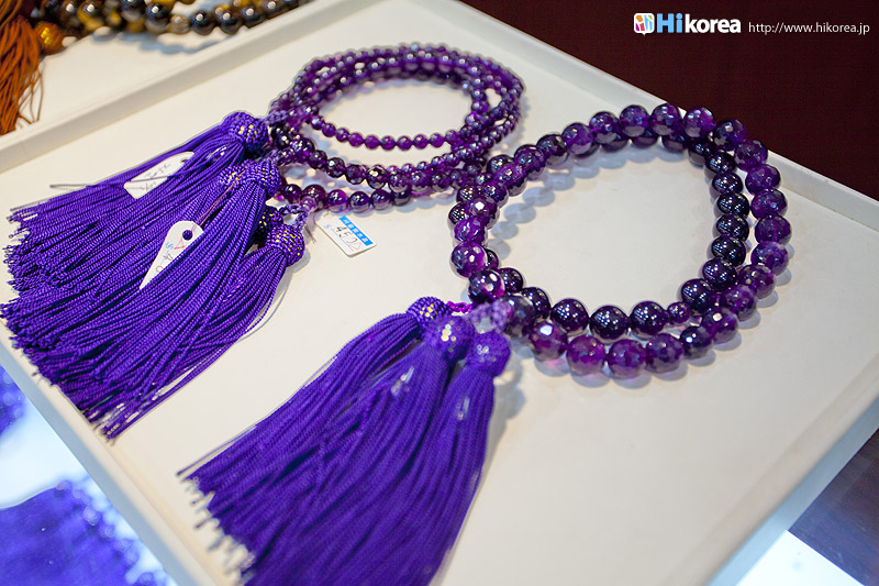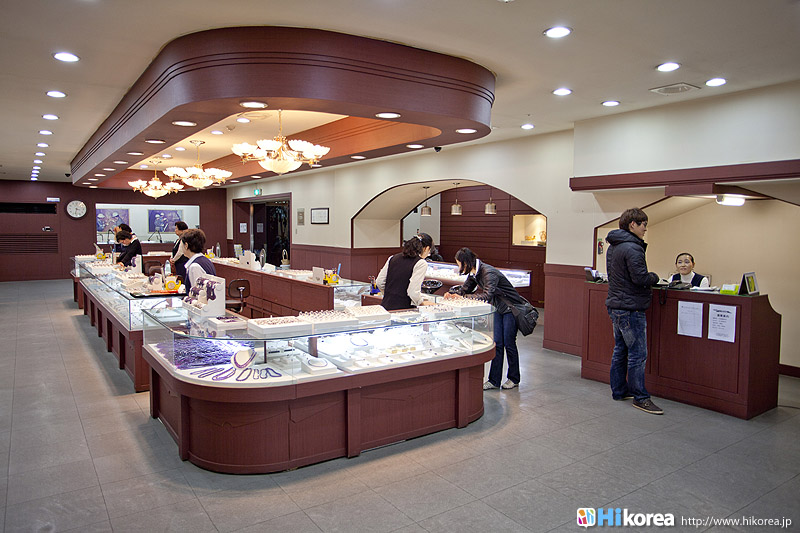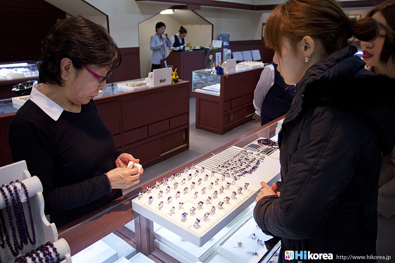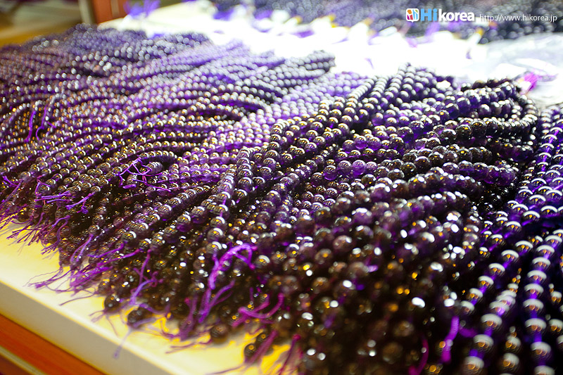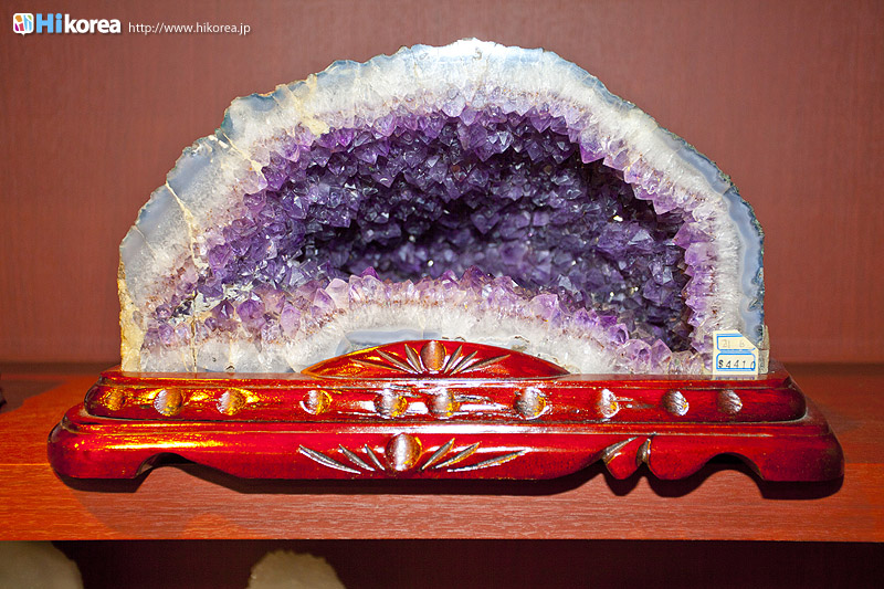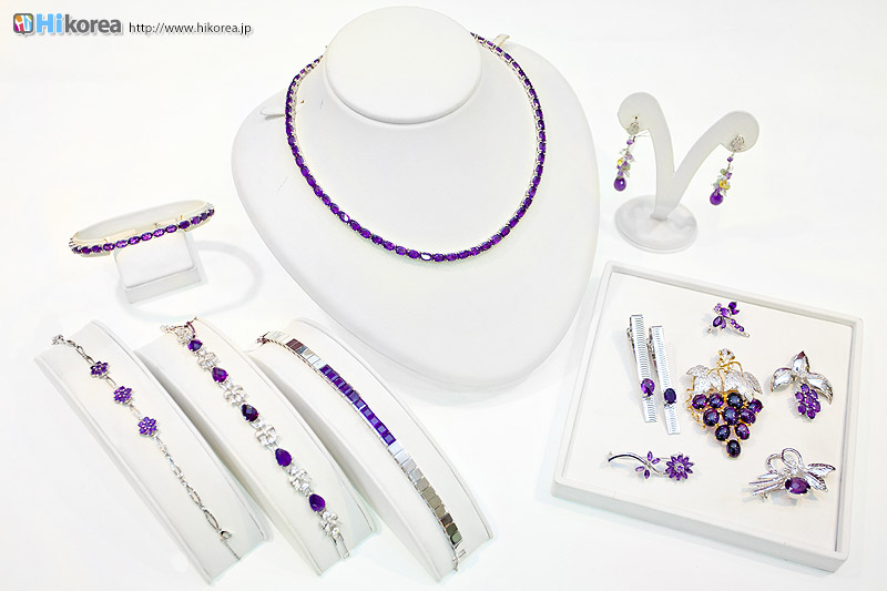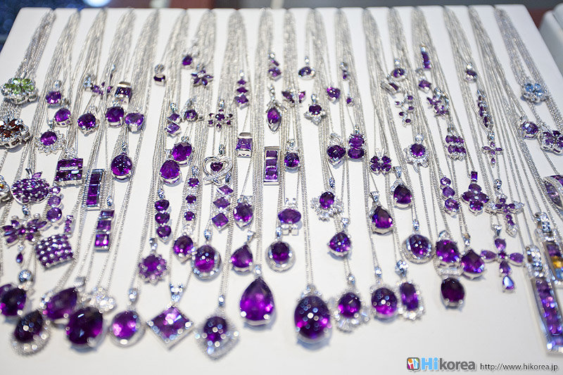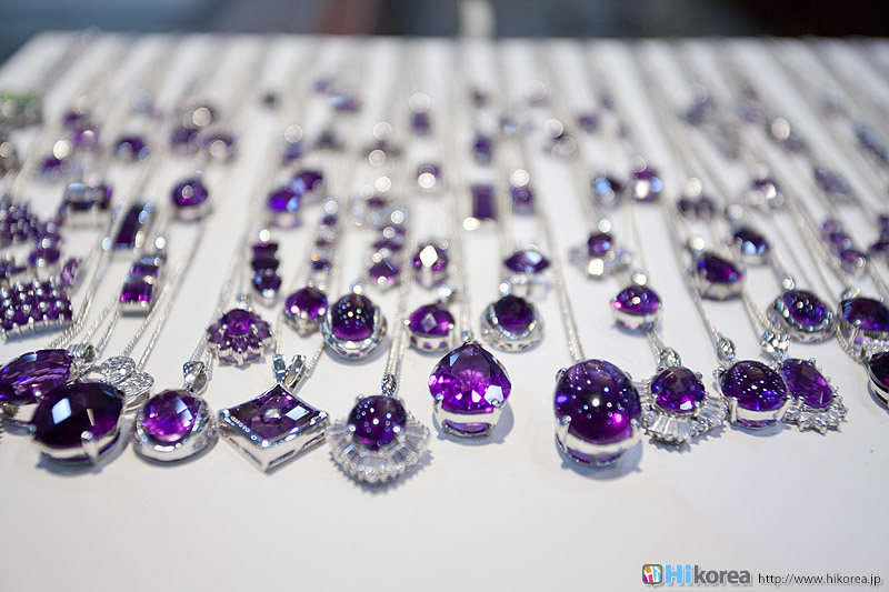 アメジストの世界へどうぞ店内に入店するとさっそく、スタッフの方が日本語で説明をしてくれます。 どの方も日本語が上手でビックリ!!説明が終わったら自由に見学ができます。 さっそく、店内にお邪魔しちゃいましょう~~!! ソウルアメジストの看板 入り口 外国人観光客の方も多い アメジストの不思議なパワー ダイアモンド、ルビー、サファイア、エメラルドと共に世界五大宝石の中の一つである紫水晶は、2月の誕生石として貞操・誠実・平和を意味する宝石言葉を持っています。 紫水晶の代名詞の様に呼ばれる国産水晶は慶南蔚州郡彦陽面が主産地で、国産水晶は彦陽紫水晶と呼称されて世界的に広く知られています。全世界産地ではメキシコ、ブラジル、サンビア、ウルグアイ等があり、国産紫水晶は他産地に比べて、赤い色合いが沢山出て、人気があり、とても高価です。 種類豊富なアメジストの数々ネックレスから指輪まで、男性はネクタイピンを購入する方が多いそう。お値段もリーズナブルなものから高価なものまで幅広く揃っています。
