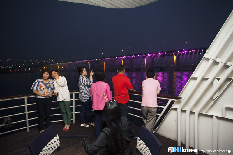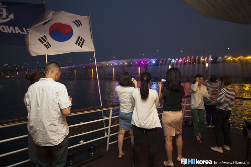 4月から10月までは毎日、盤浦大橋で虹の噴水ショーを観覧できます。漢江の岸から見るのもいいですがやはり遊覧船で見るのが目の前で見ることができて、その迫力は圧巻!!ある程度お腹もいったいになってくる頃の8時にいつの間にか噴水ショーが目の前に~~