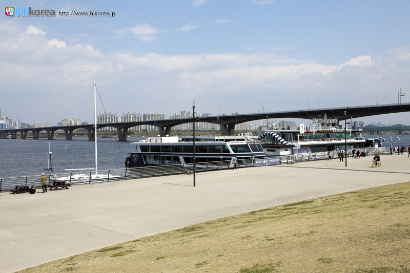 『漢江ビュッフェ遊覧船』の乗り場は、“63ビル”でもお馴染みの“汝矣島”に位置しています。汝矣島は大企業の本社やテレビ局、国会議事堂などが多く並ぶ、まさにビジネスタウン。スーツを着たサラリーマン達があちこち歩いていて、洗練されたビジネス街のイメージが強いですが、漢江の川辺では散歩を楽しむカップルや、ピクニックをする家族連れなどが目立ち、市民達の憩いの場としても大人気の癒しスポットとして名をはばかっています。遊覧船乗り場は、地下鉄5号線汝矣ナル駅3番出口から徒歩約10分の場所に位置。ソウルのシンボル的存在、漢江を眺めるには最高の絶景スポットです。