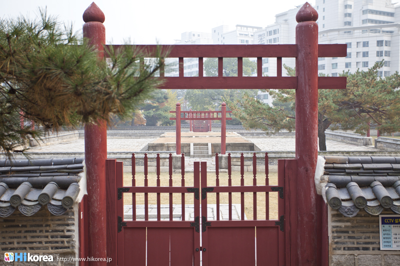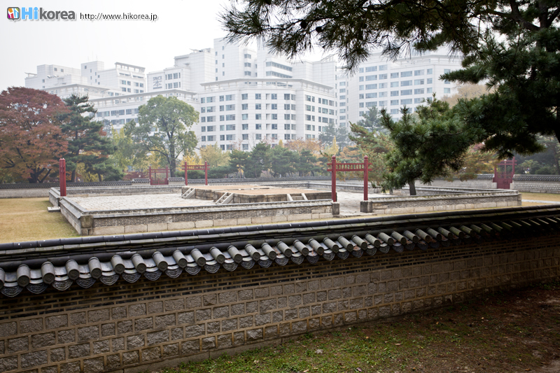 朝鮮王朝を建国した李成桂(イ・ソンゲ)は、1394年に都を開城(ケソン)から漢陽(ハニャン・現在のソウル)に移し、高麗王朝時代の仏教にかわり、朝鮮王朝では儒教の新しい学派である朱子学を国教と定めました。儒教では、宮廷の西側に“宗廟(チョンミョ)”を、東側に『社稷壇(サジクダン)』を置かなけばならないという礼法がありました。『社稷壇』は、土地を司る神である“社(サ)”と五穀を司る神である“稷(ジッ)”を祀り、国家を上げて祭祀を行う祭壇でした。国家的に重要な出来事がある時や、干ばつが発生した時などに儀式が行われるところでした。そのため李成桂は、都を開城から漢陽に移すのあたり、景福宮を建てる前の1394年に景福宮の東側に宗廟を建て、そして西側に社稷壇を建てて、その翌年の1395年に正宮・景福宮を建てました。現在は『社稷壇』を中心に約19万平方メートルの公園となっていて、市民の憩いの場となっています。 |