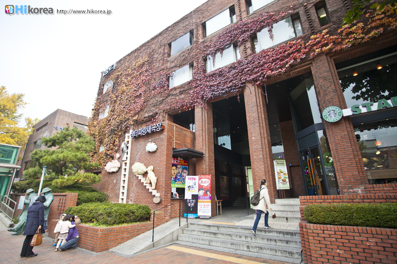 『大学路(テハンノ)』は恵化駅近くにある全長約2㌔の道路およびその周囲の地区の名称で、韓国一の名門ソウル大学がここにあったことから、「大学路』と呼ばれるようになりました。ソウル大学は移転しその後、演劇・映画・コンサート・ミュージカルなどの文化芸術団体が集まり始めて、『大学路』が“演劇の街”となっていきました。また“マロニエ公園”では、週末になるとバンドや歌手・ダンスグループ・コメディアンなど夢を持った若者たちが、公園内でパフォーマンスを行っています。公演を見に行ったり、パフォーマンスを見に行ったりするのも楽しいでしょう。現在は小劇場を始め美術館・文化施設、お洒落なカフェやレストラン、はたまたファーストフード・ロックカフェ・バーなどの若者が好むお店が密集しています。 |