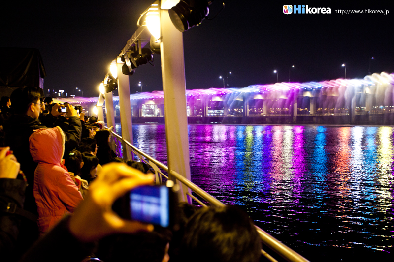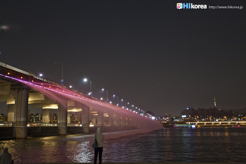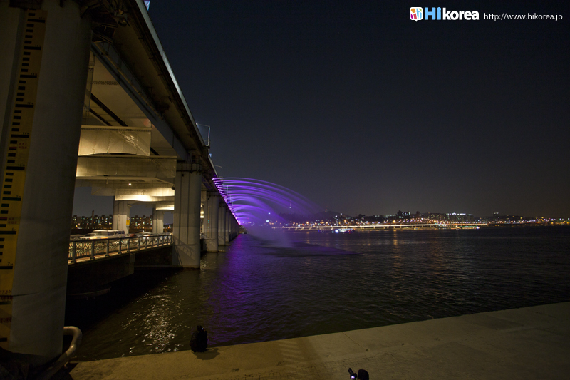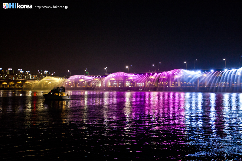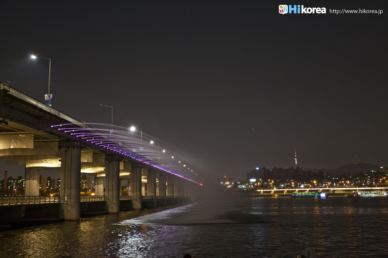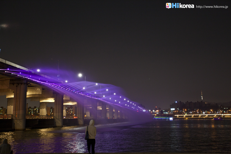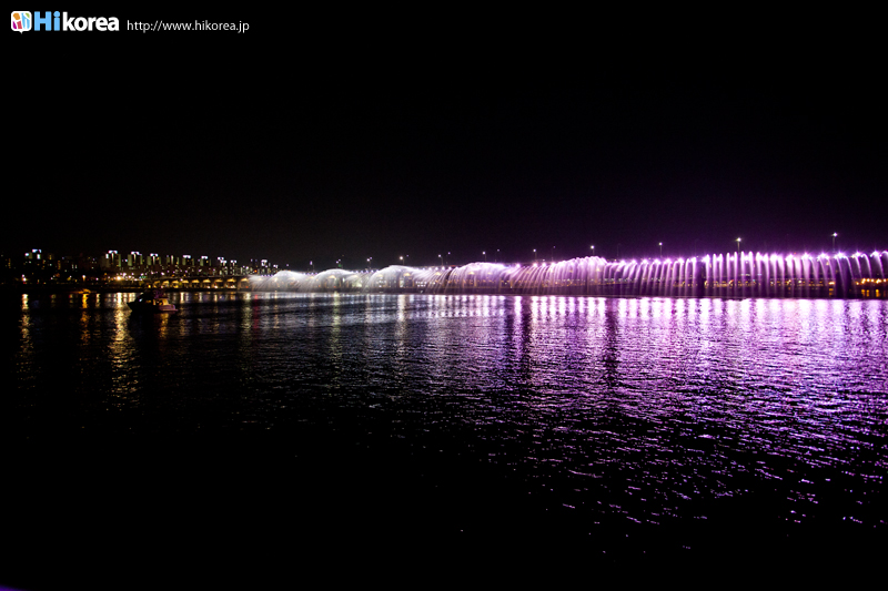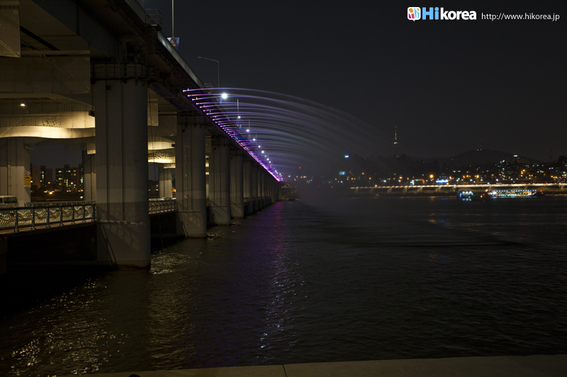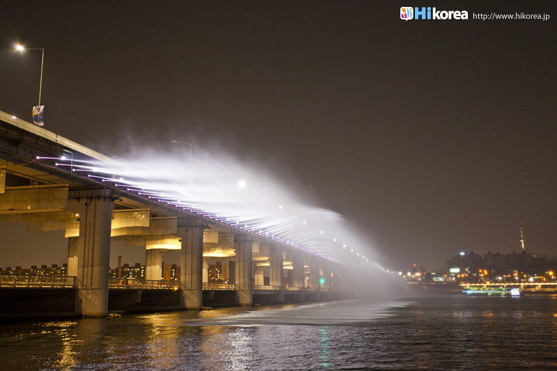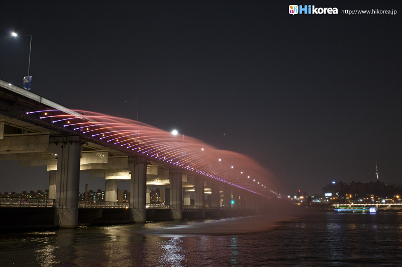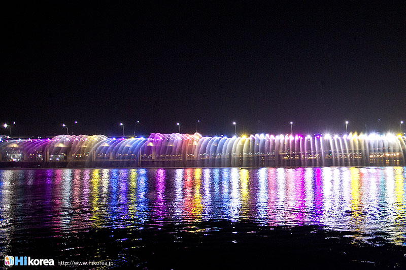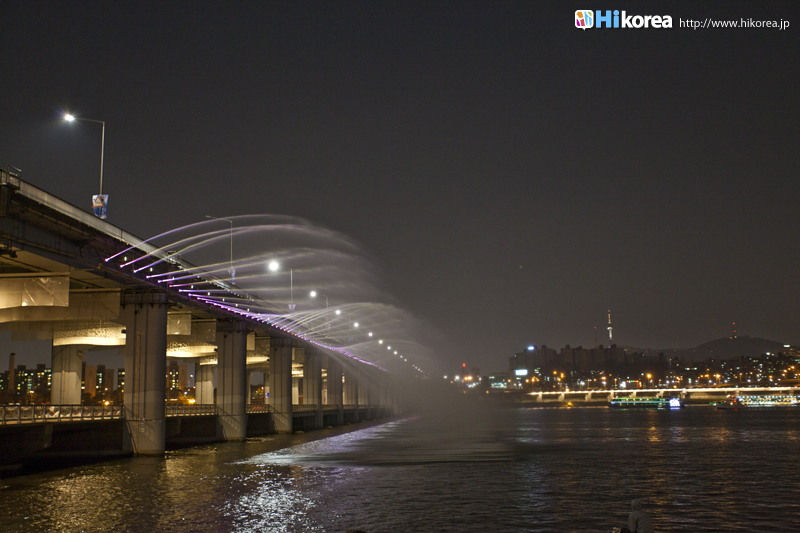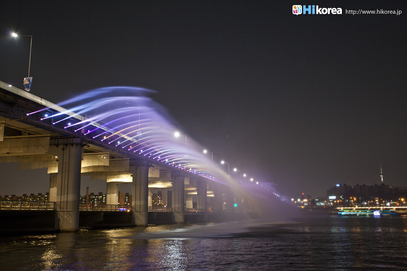 『盤浦大橋(パンポデギョ・潜水橋)』は、ソウルの中心を悠々と流れている漢江に架かっている橋のひとつで、漢南大橋と銅雀大橋の間にある橋です。この橋は毎日決まった時間になると音楽に合わせて踊る噴水ショーが見もので、特に夜になると“ムーンライト・レインボー噴水ショー(タルピッ ムジゲ プンスショ)”といって設置された200個のライトが美しい虹模様の夜景を披露してくれます。そして昼は昼で、柳の葉をイメージしたものなど百種類余りの形の噴水が楽しめるようになっています。そして、もう一ヶ所漢江遊覧船の船上から真正面に見るのも素敵です。また『盤浦大橋』の袂には“盤浦漢江公園”が広がり、噴水・野外舞台・広場などがある市民の憩いの場となっています。そして、この噴水の長さは1,140mと、世界で最も長い橋型噴水としてギネスブックにも登録されています。