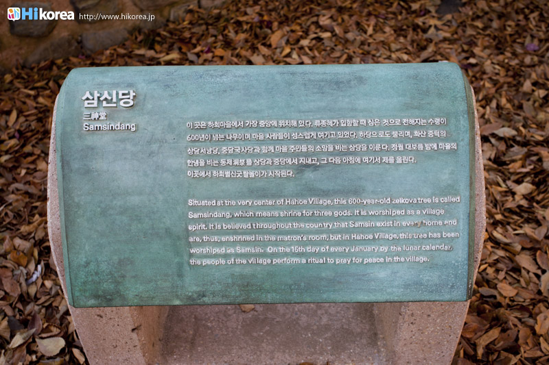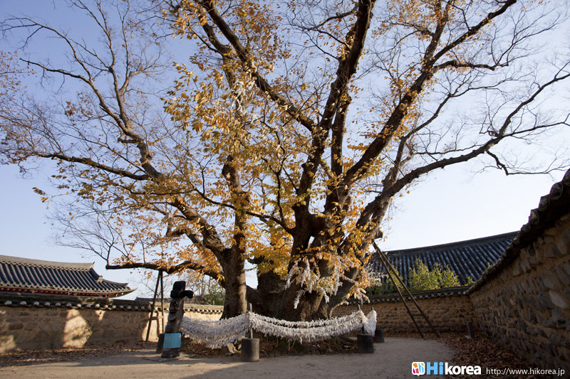 みなさん!!アンニョンハセヨ@^^@今日は安東の河回村にある三神堂をご紹介します。三神堂は河回村の中央に位置する高さ15m、周囲5.4mの老巨樹のけやきで、樹齢600年以上とされる木がある場所です。この空間は河回村のアクロポリス広場のようなところで、ここで村の重要な会議を行ったり、夏には村の大人たちが集まり涼しい風にあたりながら世間話をしたり、子供たちの遊び場でもありました。また、河回別神クッと言う仮面劇の仮面踊りが最初に行われていたところで、 ソナンダン · グクサダンと風水地理上の村の穴にあたり、ハダン( 下 堂 )とも呼ばれます。 正月に村を守ってくれるトンシン( 洞 神 )に安寧と無病、豊作を祈る同( 洞 祭 )がここで行われました。現在も河回村を訪れる多くの観光客がここを訪ね、願いを成就させるために願い事を書いた紙をご神木につけています。皆様も河回村を訪れた時は必ず立ち寄り、願い事を書いてみてくださいね。~~*^^*