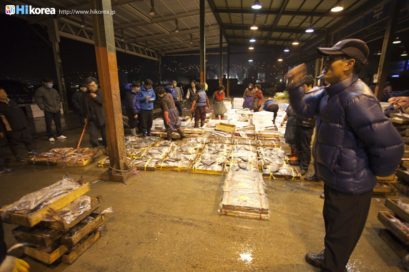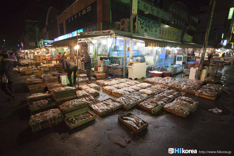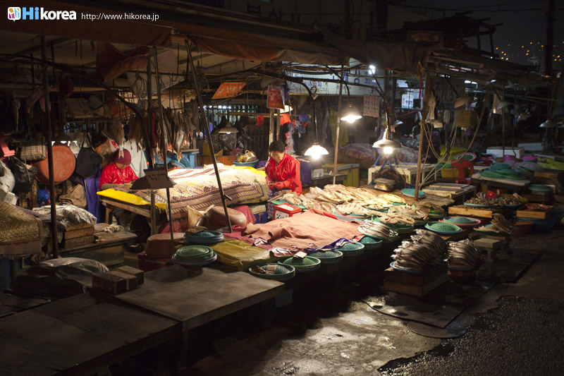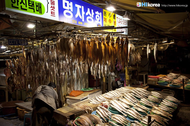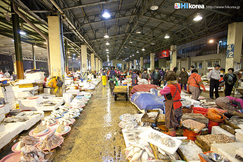 韓国最大の魚市場である『ジャガルチ市場』は朝鮮戦争の後、戦争で夫を亡くした女性達が南浦洞(ナンポドン)の路上で魚を売ったのがその始まりです。 この一帯は砂利の多い場所だったため、韓国語で言う砂利(チャガル)処(チ)、チャガルチ市場となったそうです。また2006年には地下2階、地上7階にジャガルチ水産ビルができ多くの業者が、この中で営業しています。2階にはずら~っとお刺身屋さんが並んでいて、1階で買ったお魚などを持っていくとお好みの方法で調理してくれます。お刺身にして残ったアラも、きちんと最後にメウンタウンも作ってくれるので満足度100点です。また1992年から“オイソ(来てね)、ボイソ(見てね)、サイソ(買ってね)”(釜山の方言)というスローガンを掲げて、毎年10月8日から11日頃にジャガルチ文化観光祭りが開かれています。