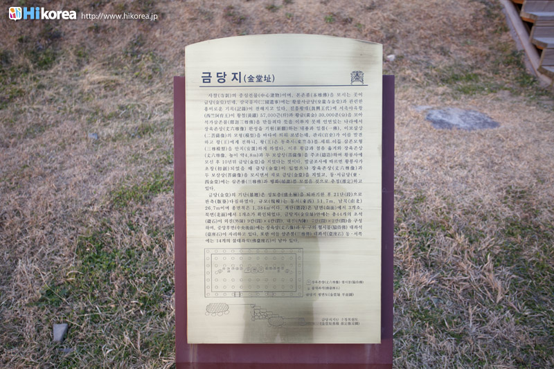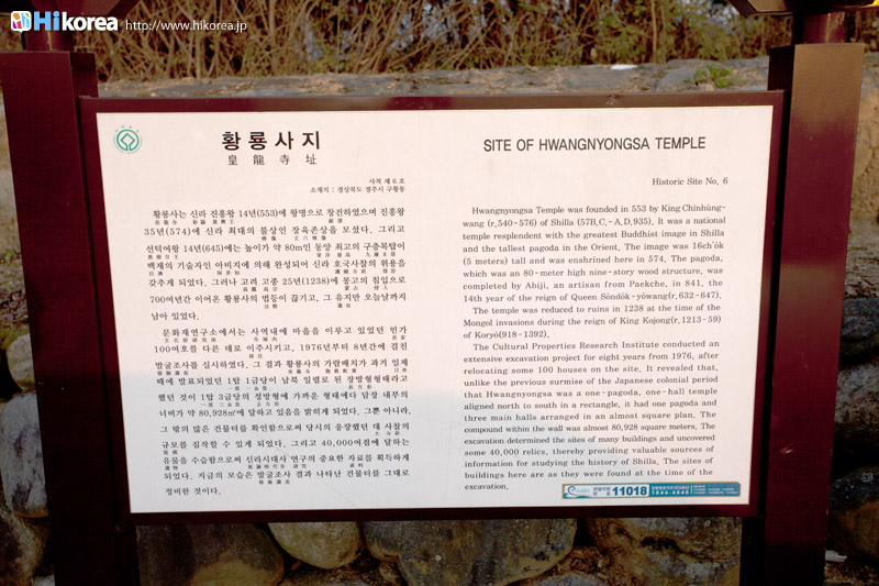 韓国慶州市の東南、九黄洞(クファドン)にある新羅王朝官寺跡地です。新羅時代真興王14年(553)に王命により創建され、本尊の6尊仏は東35年に鋳造されました。真平王6年(584)に金堂が完成され,善徳女王14年(645)に塔が竣工された中門から北の方に塔、金堂、講堂が一直線で竝んであります。周りには回廊が取り巻く伽藍が配置。1976年以来の調査で金堂の東西にあった建物の名残が発見され、百済式三金堂であることが判明しました。 .