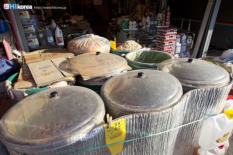 『南部市場』は、味処全州を代表する一番大きな伝統市場です。縦横無尽に広がる市場内には、新鮮な旬の果物を売る果物屋やごま油屋、八百屋、韓方薬店、魚屋、豚一匹吊るされた精肉店、はたまた衣料店、寝具店までありとあらゆる物が売られています。そして、メインの『南部市場』の通りだけでなく橋の上や向かい側の河川敷では、自家農業や自分で作ったものを売りに来ている人たちのお店が出ていたりするので、それらを見ながら値段交渉するのも楽しいです。また、全州のコンナムルクッパッには二種類のコンナムルクッパッがあるのですが、ここ『南部市場』は、ご飯を熱いスープに入れて混ぜて食べる“南部市場式コンナムルクッパッ”の発祥の地でもあります。ランチタイムともなれば食い倒れ横丁(モッチャゴルモッ)が大勢の人でごった返します。