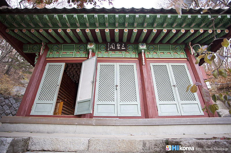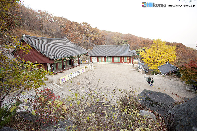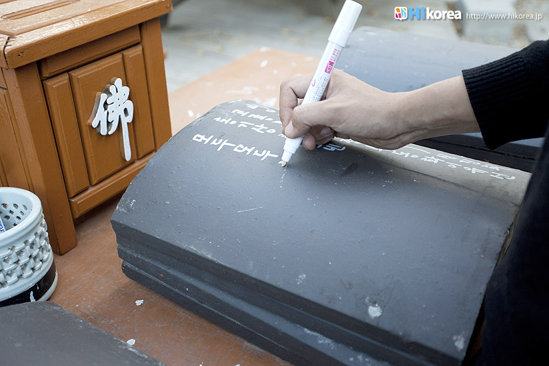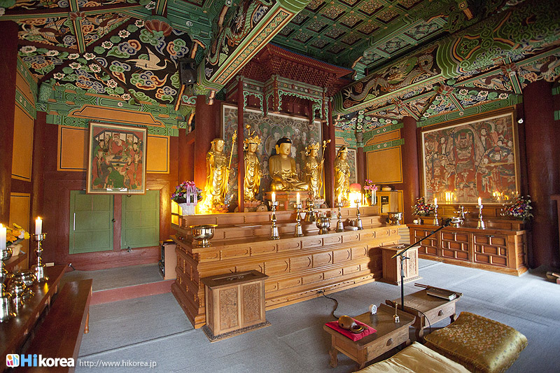 新羅徳善女王 (シンラソントクヨワン)8年(639)懷正禅師(フェジョンソンサ)が創建して淨修寺(チョンスサ)と称したものを、朝鮮世宗8年(1426)涵虛大師(ハモテサ)が修復の時、お寺の東側から清水が湧き出たことから浄水寺(チョンスサ)と改名したと言われています。このお寺の法堂は、朝鮮初期の柱心包式建物で正面3間、側面4間の平屋建切妻で、正面の縁側部分は後代になって継ぎ足して建てたと見られ、当初は正面3間、側面3間の建物であったと推定されます。そして、この法堂は他では見ることのできない珍しいものとして、一枚板を使った扉に蓮花の紋様を彫刻した特異なものがあります。周囲の森とハスの花の彫刻は人々を魅了する美しさです。江華島の南にある摩尼山に位置![]() ひっそりとしたたたずまい大雄宝殿 大雄宝殿内部 三聖閣 三聖閣内部 いろんな人の名前が刻まれてる岩 五百羅漢殿 薬水 垂直の岩にコインが乗れば願い事が叶うと言う 塔 参道 新しく建立される建物の瓦に願い事を・・・ 1枚10000ウォン 浄水寺は、普門寺・伝燈寺と並んではずすことのできない江華三大寺院中のひとつです。この寺は善徳女王8年(639)に懷正禅師が摩尼山頂上にある塹城檀に参拝した後、ここの土地の形勢を見て弟子が集中して精進するところとして、ここにお寺を創建しました。また、浄水寺を修復した涵虚堂己和和尚は、朝鮮初期を代表する高僧で、排仏の風潮の中から政治と法律を守護して誤解と無知をなくすために大きく努力した人です。この寺の前の渓谷は、この堂号を借りて涵虚洞天渓谷と呼んでいますが、ここ浄水寺には涵虚和尚の精神があちこちに染み込んでいます。また、涵虚和尚が出世した時代は高麗王朝と朝鮮王朝が交替した激動期で思想的にも国家の指導理念が仏教から儒教に変わるようになった時期で、浄水寺はそんな時期に建てられたお寺です。ぜひ、普門寺と伝燈寺と合わせてお参りして見て下さい。 |