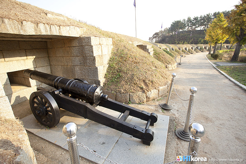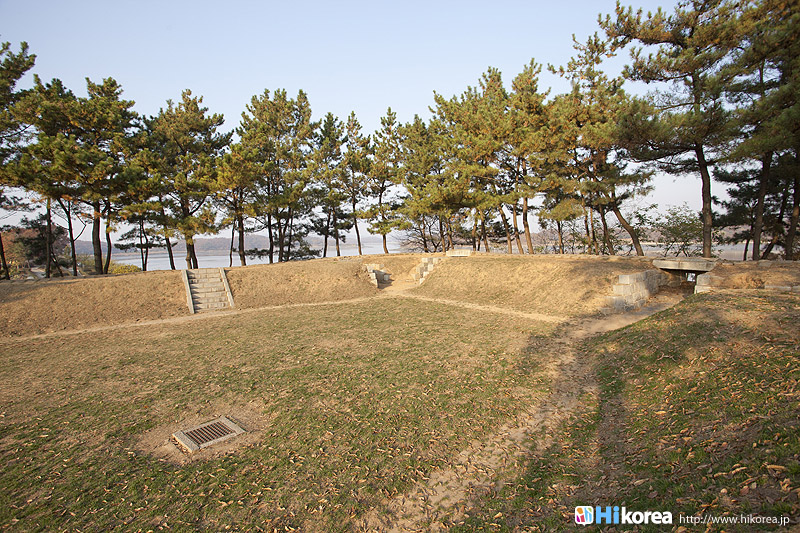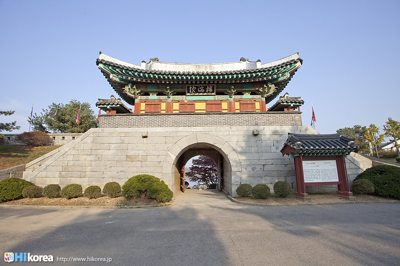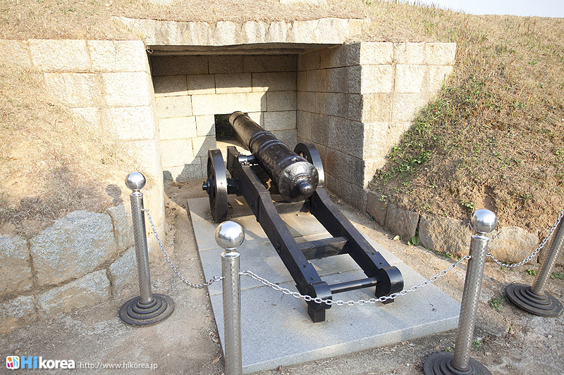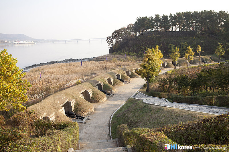 徳津鎮は朝鮮時代、江華海峡を守る要衝地として、孝宗7年(1656)国防力強化のために造られ、粛宗5年(1679)龍頭墩台と徳津墩台を建て、徳津砲台と南障砲台を有することによって、江華海峡で一番強力な砲台として知られていて5鎮7堡の真ん中で一番重要な所を守っていました。フランス軍の侵略丙寅洋擾(1866)の時は梁憲将軍の部隊が徳津鎮を通る鼎足山城に入っていくフランス軍隊を撃破し、1871年アメリカ軍の侵略の辛未洋擾の時はアメリカ艦隊と一番熾烈な砲撃戦を始めたところです。また徳津鎮には大院君の命で建てられた警告碑がありますが、これはいかなる外国の船舶もみだりに海峡を通過できないという当時の鎖国の強固さを誇示しているのです。広城堡と草芝鎮の間にある砲台・徳津鎮徳津鎮は江華島の南東に位置し、広城堡と草芝鎮の間にある砲台のひとつです。また江華島にある砲台としては、江華海峡を望む沿岸の北から甲串墩台・広城堡、そしてこの徳津鎮と続き一番南にあるのが草芝鎮です。徳津鎮には、ソウルから地下鉄2号線、新村駅から出ている3100番のバスに乗れば、乗り換え無しで行くことができます。また、徳津鎮のある江華島はソウルを流れている漢江の河口にあり、ソウルから北西に50Kmのところに位置しています。島の北側は北朝鮮の黄海北道と面して北朝鮮と隣り合わせの島となっています。因みに江華島は、高麗人参、赤カブ、よもぎなどが有名で、それを使った料理もたくさんあります。また、江華島は干潟大国だけあり、そこで育ったうなぎも有名なので、ぜひ一度食べてみてくださいね。 ![]() 門楼である控海楼徳津鎮の駐車場から券売所の方へ歩いて行くと、大きな楼閣が飛び込んできます。それは門楼である控海楼で、門の中の天井には青龍の絵が描かれています。この門をくぐると目の前には高麗人参畑が広がり、その向うには江華海峡を望むことができます。 徳津墩台南障砲台南障砲台は、徳津鎮に所属する江華の8つの砲台の中のひとつで、低い位置に砲座を設置し、江華海峡を通過する船舶を攻撃することができるように造られました。また、南障砲台では10門の大砲が配置されていて、江華陣地の中で一番強靭な火力を誇ったところで、高宗8年辛未洋擾(1871)の時、徳津墩台と共にアメリカ艦隊と熾烈な砲撃戦を展開したところです。 徳津鎮警告碑徳津鎮警告碑は徳津鎮の南壇にある徳津砲台の前にあり、朝鮮高宗4年(1867)に興宣大院君の命により、江華徳津僉使が建てました。開化黎明期に外国の船舶の出入りを統制するため、警告として建てられました。碑文には「海門防守他国船慎勿過」と刻まれており、これはどんな船舶もむやみにこの海峡を通過できないという鎖国の意志を表していたのです。また、警告碑の右下には弾痕の痕が、今も生々しく残っています。ちなみに、碑の大きさは、高さ147cm、幅54.5cm、厚さ28cmとなっています。 開国の波に打ち寄せられて・・・徳津鎮いかがでしたか?日本も幕末に黒船がやって来て、西欧列強に開国を迫られた時は脅威だったでしょうが、やはり朝鮮王朝末期にも同じく開国の波は押し寄せて着ていたのです。そんな歴史に触れてみるのもいいでしょう。広城堡と草芝鎮・甲串墩台と合わせて見るのをお勧めします。 |