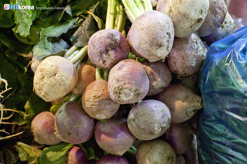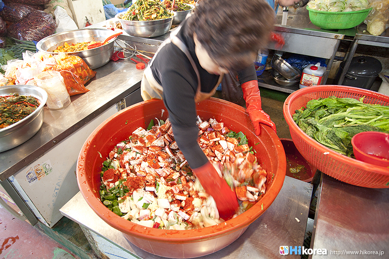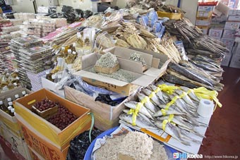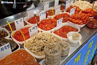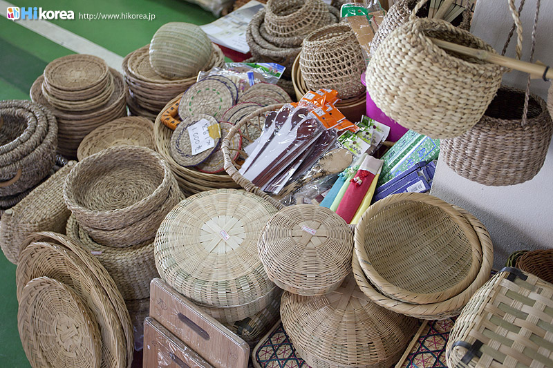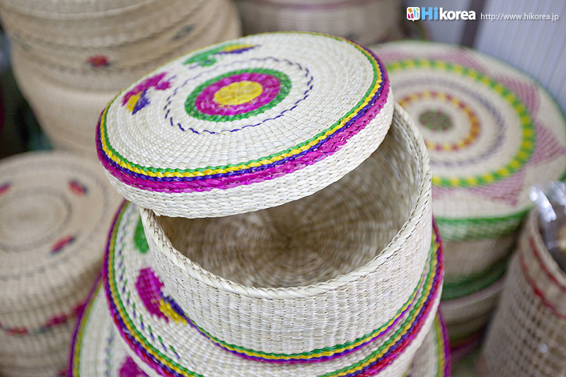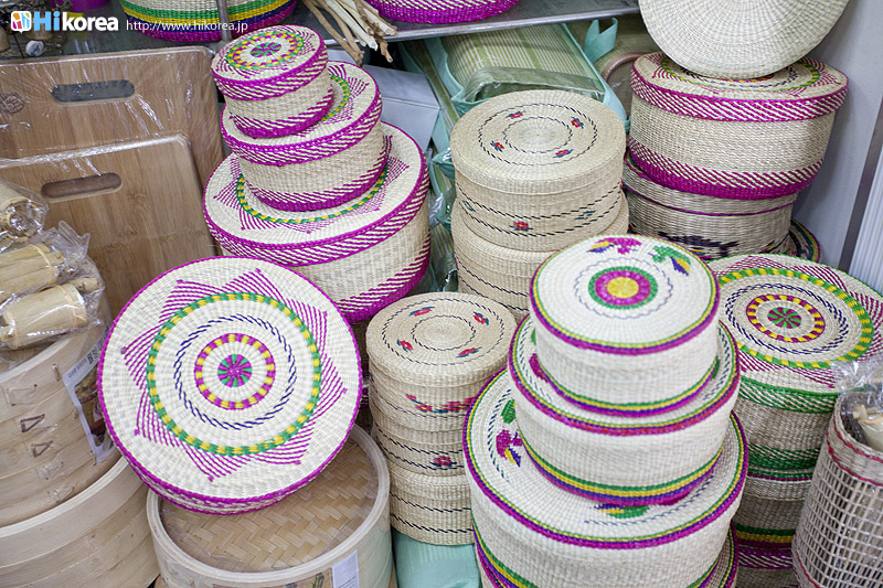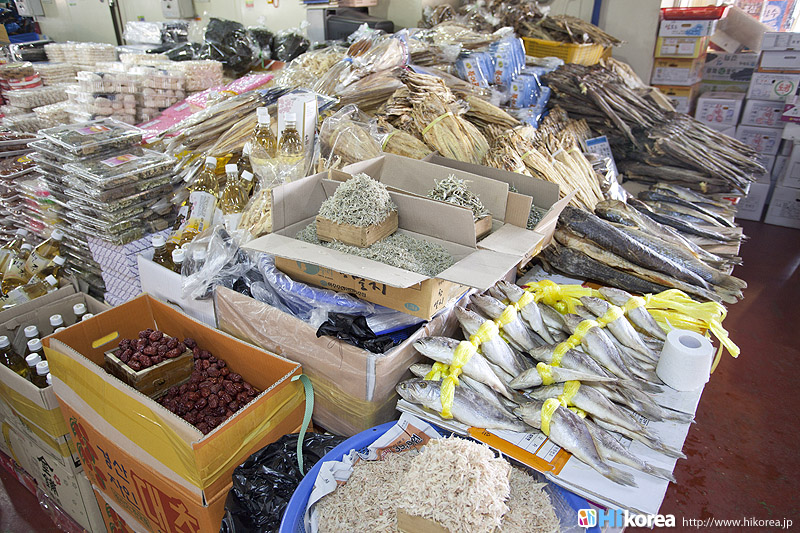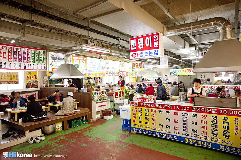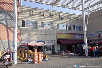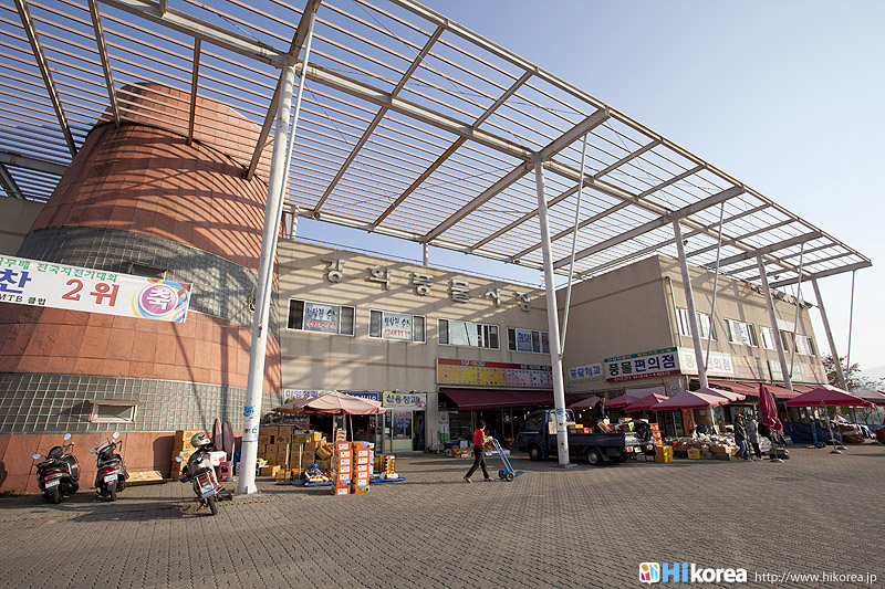 江華(カンファ)バスターミナルのすぐ隣りにあるのが風物市場(プンムルシジャン)です。風物市場は江華島民俗名所化事業の一環として、2007年に新築された新しい市場です。市場の1階には野菜や果物、キムチ、塩辛やお刺身センターなどかあり、“カッカジュセヨ”と値段交渉するのも楽しいし、2階には数多くの食堂があり、新鮮な造りを楽しむことができます。また、サッパ(ままかり)が有名なので、ぜひ一度召し上がってみてください。そして忘れてはいけないのが、2階にある花ござ(花紋席)を使った商品を売るお店や、乾燥よもぎを中心にした韓方薬のお店です。日本にはない韓国独特のカラフルなござも綺麗です。風物市場は、目もお腹も満たしてくれる市場です。 江華バスターミナルのすぐそば風物市場はソウルから北東に50kmのところに位置している江華島にあります。新村から3000番のバスに乗って1時間、江華バスターミナルに到着すると、まさにその横が風物市場です。江華島を訪れたら歴史探訪をするのも楽しみのひとつですが、その土地でしか食べる事ができないものを食べたり、その土地でしか買えない名産品を買ったりするのも、楽しみのひとつではないでしょうか。そんな楽しみを、かなえてくれるのが風物市場です。 ![]() 風物市場 1階売場赤カブにのキムチを漬けている様子 サッパの塩辛 あみえびの塩辛 やはり、長年培ってきた勘と言うものでしょうか。また、もうひとつの江華島名物のサッパ(ままかり)とあみえびの塩辛がドラム缶で漬けられてるのには、ちょっと驚いてしまいました。 サッパとあみえびの塩辛はキムチを漬ける時の調味料になるんだそうです。また、奥の一角には鮮魚店が軒を並べ、新鮮な魚貝類が売られています。→ 赤カブのキムチ キムチ 赤カブのお漬物 塩辛や明太子など 果物屋 干物屋 八百屋 韓方薬 塩辛とケジャン 風物市場 2階売場・食堂日本から嫁いだ果物屋の女将さん亀石富美子さん江華島の風物市場いかがでしたか?風物市場には、日本人にとっては嬉しい事に、市場の入口にある果物屋さんシンヨンチョンクァ(신용청과)には日本人の亀石富美子さんという女将さんがいて風物市場に日本のお客さんが来たときは、市場の中を案内してくれるそうです。亀石富美子さんは16年前に日本の岡山から江華島に嫁いで来たそうです。風物市場に行ったときは一度声をかけてみてください。とても気さくに話してくれますし、時間があるときは一緒に案内してくれるそうですよ。そして、なんと言っても地方の市場は楽しいです!確かにソウルの中にある市場も楽しいですが、地方には地方の市場の特色や名産品があって、とても楽しいです。ここ風物市場は江華島の魅力がいっぱい詰まった市場です。また、毎月2,日、7日には風物市場で、とうがらし市も開かれています。江華島にいく時は一度訪ねてみてはいかがでしょう。 |