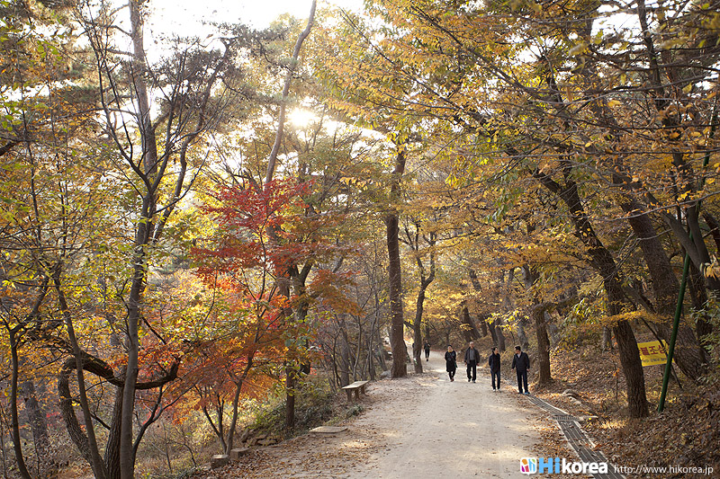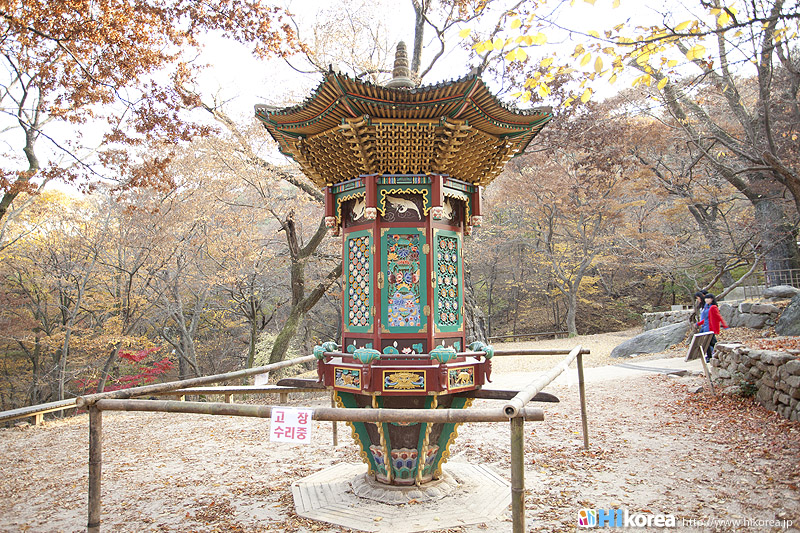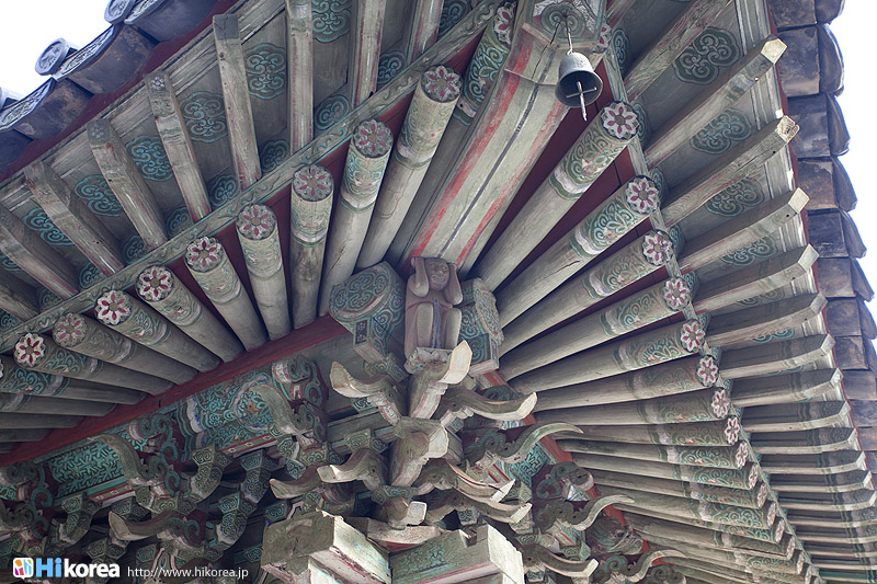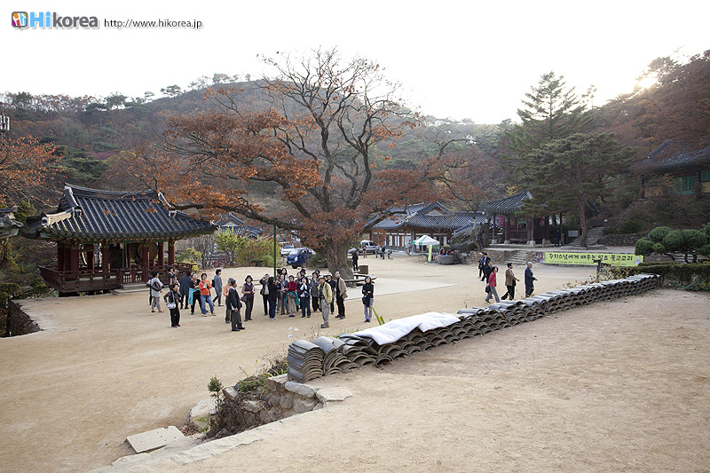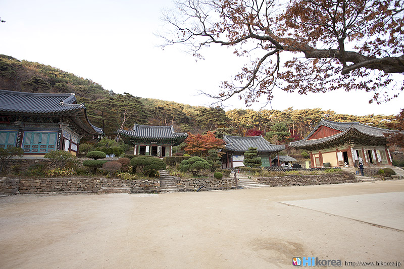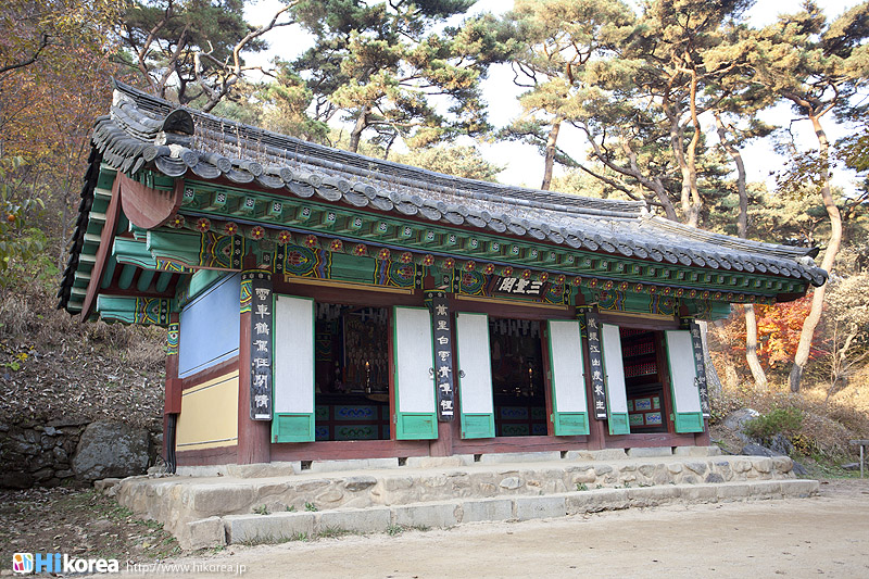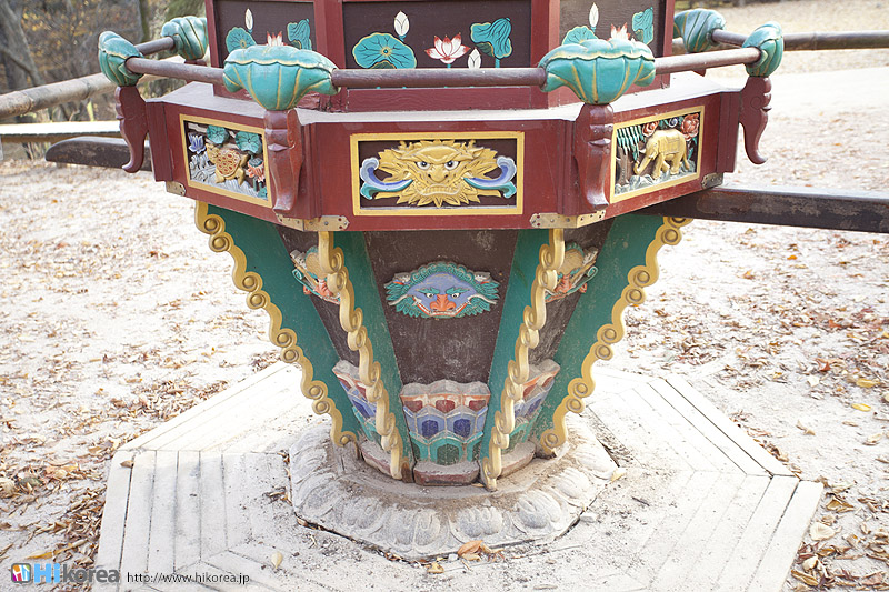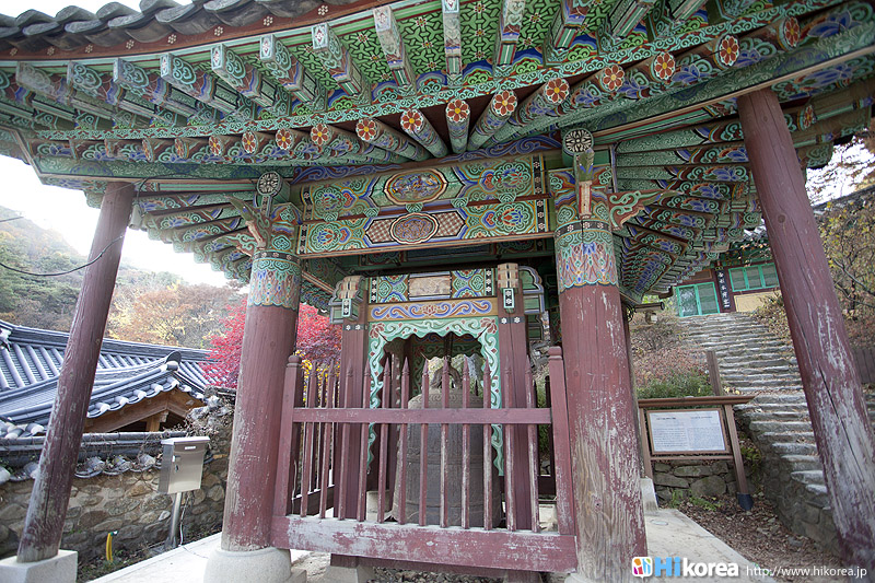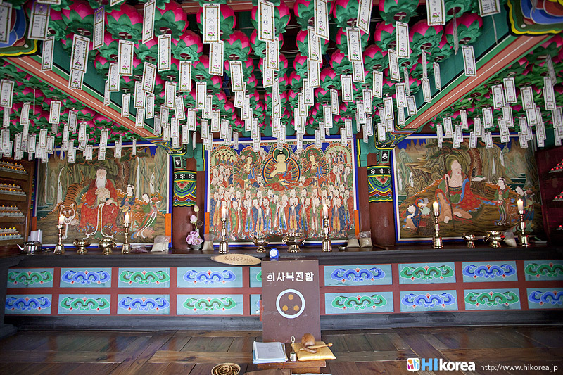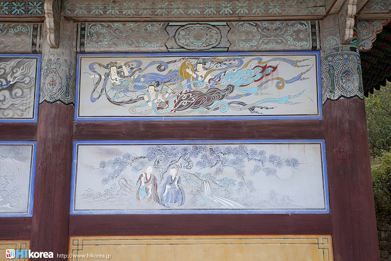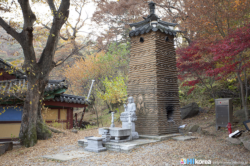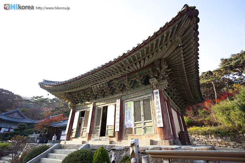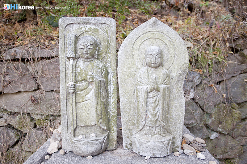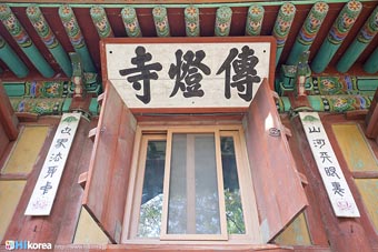 伝燈寺(チョンドゥンサ)は現存する韓国最古の寺刹です。そして韓国に初めて仏教が伝わったのが372年、阿道という僧侶によって伝えられ、その阿道和尚が381年創建したのが伝燈寺です。この伝燈寺は、高句麗・小獣林王時代には“真宗寺”と呼れていましたが、1282年高麗の忠烈王の貞和王妃が仏殿に玉燈を献納して以来、伝燈寺と呼ぶようになりました。名前の由来は“仏法の燈火を伝える”というところから名付けられたと言います。 また伝燈寺は大雄殿と薬師殿をはじめとし、見どころの多い寺です。特に、大雄殿には他の寺では見られない珍しい彫刻があり、薬師殿は建物の中の彫刻が美しいことで有名です。また寺の庭には中国、宋の国の梵鐘があります。江華島の南東にある鼎足山に位置伝燈寺(チョンドゥンサ)は江華島の南東側にある鼎足山に位置していて、三朗城の中にあります。伝燈寺には、ソウルから地下鉄2号線、新村駅から出ている3000番のバスに乗り、江華バスターミナルで51番バスに乗り換えれば辿り着きます。伝燈寺のある江華島は韓国内の島では5番目に大きく、小島を含める総面積は約408km²、人口は約7万人ほどです。また、ソウルから約1時間、北西に50kmのところのに位置しています。江華島は干潟が有名で、そこで育ったプリップリのおいしいうなぎを食べさてくれるお店がずら~っと並んでいる“うなぎタウン”があるほどです。そのほか、赤カブ・高麗人参・花ござ、そして良質なよもぎが採れることでも有名です。 ![]() 三朗城三朗城は別名鼎足山とも言い、城が造られた年代は確かではないですが、壇君が三人の息子に城を造らせたところから三朗城と名付けられたということが、「高麗史」に記録されています。初めは土だけの土城だったのですが、三国時代になってその上に割り石を合わせて積んで頑丈な石城に建築されました。城内には伝燈寺はもちろん高麗時代には假闕、朝鮮時代には史庫と璿源譜閣がありました。また、丙寅洋擾(1866)の際、梁憲洙将軍がフランス軍を退け、ここで保管されていた「朝鮮王朝実録」と王室の家系図である「璿源譜」を守った場所でもあります。そして、その後1976年に南門である宗海楼を原形のまま復元しました。 伝説のある大雄宝殿大雄宝殿は朝鮮光海君13年(1621)に再び建てられた前面3間、側面3間の木造の建物です。また大雄殿には他の寺では見られない珍しい彫刻があります。軒下の裸体女人像と柱の上の人物彫刻がそうです。この人物彫刻には伝説があります。昔、大雄殿を建てる時に棟梁がふもと町の酒場の女性に心を奪われ、稼いだ金を女性に全部やったのに逃げられました。それで棟梁は病気になり、その仕返しに女性の裸の姿を徹夜で彫って、重い軒を支えさせたということです。 薬師殿の内部 軒下の裸体女人像 薬師殿薬師殿は全ての人の病気を治してくれる薬師如来を祭っているところで「大雄殿薬師殿改瓦重修記」に朝鮮高宗13年(1876)大雄殿と共に瓦を替えたという記録があるだけで、いつ建てたのかはっきりとわかりませんが、建築様式が大雄殿とよく似ているので、おそらく朝鮮中期の建物と推測されています。大きさは前面3間、側面2間で、屋根の形は八の字の形になっています。また、建物の内部の天井は井の字型に設計し、その周りは豪華な彫刻と彩色を加え、蓮の花や蔓の模様などが描かれています。 梵鐘伝燈寺の梵鐘は、中国の宋の国懐州・崇明寺から送られたもので、鐘には中国河南省百厳山崇明寺の鐘ということと、北宋の哲宗4年(1097)に鋳造されたことが刻まれています。第2次世界大戦の時、日本軍が兵器を作るために富平の兵器庁に持って行ったものを独立後、元の場所に戻したものです。 鼎足山史庫鼎足山史庫は朝鮮時代の実録を保管していた史庫です。壬辰倭乱(文禄・慶長の役)の以前には、実録を保管していた史庫は内史庫である春秋館と忠州・星州・全州の三つの外史庫がありましたが、壬辰倭乱(文禄・慶長の役)の時、全州の物以外全部焼失してしまいました。その後、壬辰倭乱の戦災から免れた全州史庫本が漢陽(ソウル)から近い江華に移され、宣祖39年(1606)4月に復印を完了し、原本は摩尼山史庫に保管され残りは春秋館・妙香山・太白山・五大山史庫に保管されました。摩尼山史庫は丙子胡乱の時の被害と孝宗4年(1653)史閣の焼失により、三朗城内に鼎足山史庫を建立し、そこに実録原本を保管しました。 梁憲洙勝戦碑丙寅洋擾(1866)の際、フランス軍を退けた梁憲洙将軍の功績を称える碑で、側面には“巡墲千総梁憲洙勝戦碑”と刻まれています。梁憲洙将軍は、憲宗14年(1848)武科に合格し、その後官職を経て、丙寅洋擾時フランス軍を撤退させるのに重要な役割をした人物です。勝戦碑には、梁憲洙将軍を始めとする367人の名前と当時の戦況を詳しく記録されています。大きさは全体の高さが181cm、碑の高さが163cm、幅が60cm、厚さが27cmとなっています。 三聖閣・冥府殿・香爐殿 |