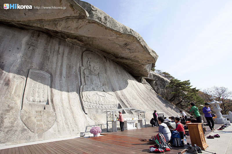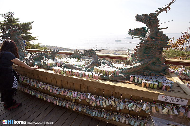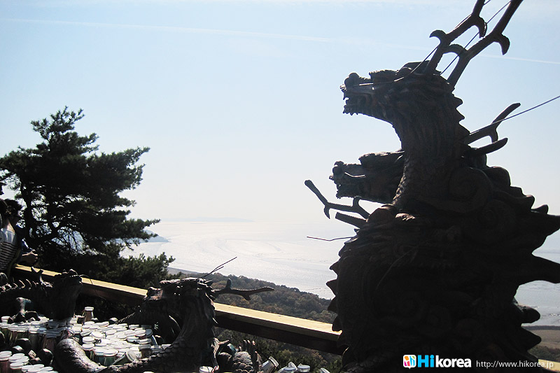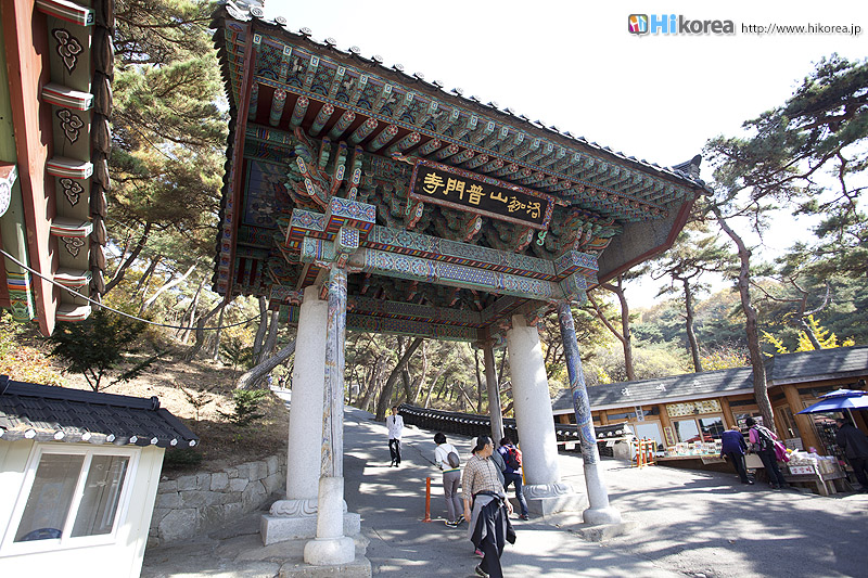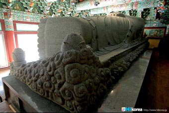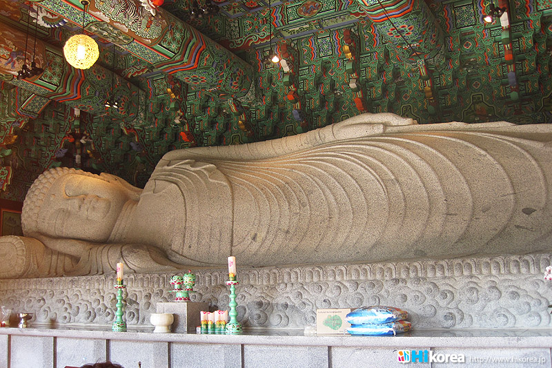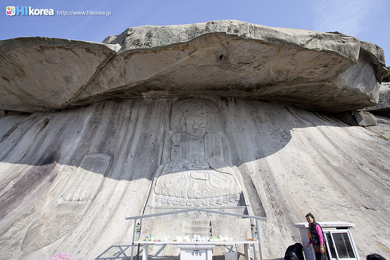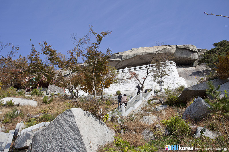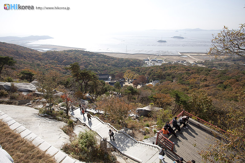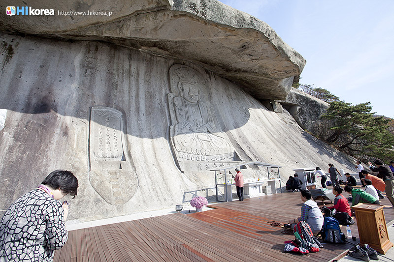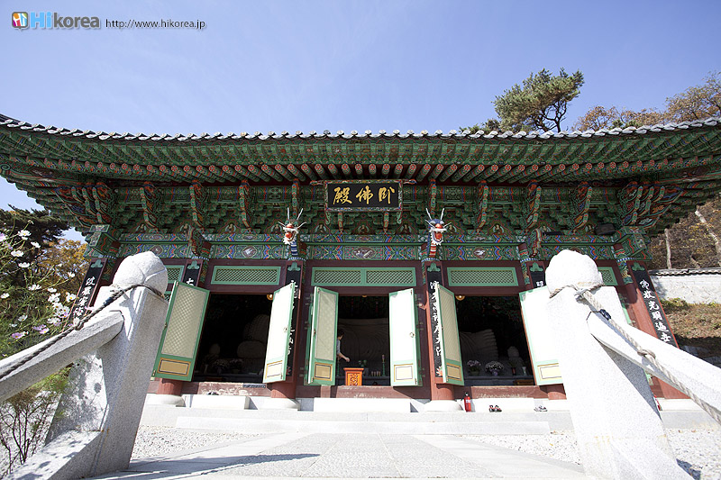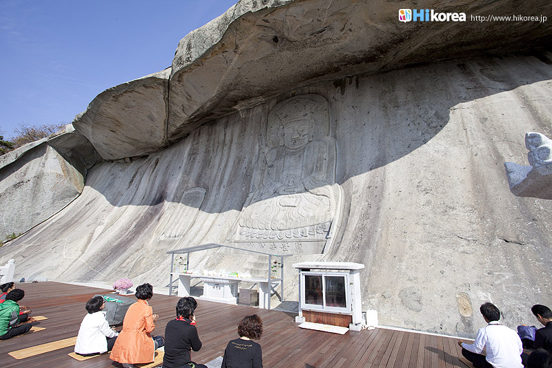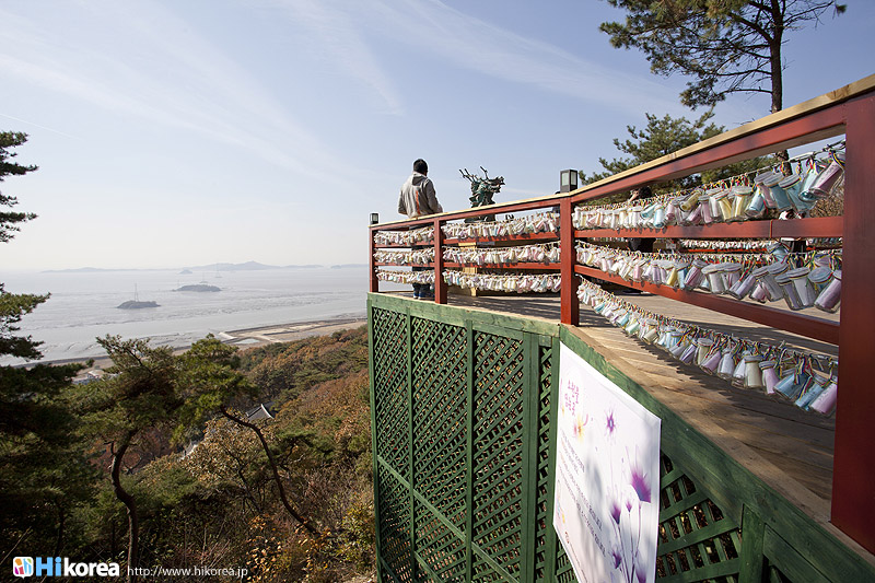 江華島から船で西に約5分の席毛島の洛迦山の中腹にある「普門寺」は、襄陽洛山寺と錦山菩薩庵と共に韓国の三大祈祷院です。新羅時代の善徳女王4年(635)に犠正大師が金剛山(北朝鮮)で修行し、ここにやって来てお寺を創建したと伝えられています。漁夫の網にかかった仏像を並べて奉った石窟羅漢殿と、1928年に金剛山・表訓寺の住職(当時は日帝時代でまだ分断されていなかった)と普門寺の住職が、眉毛岩に彫刻したと言われる高さ9.2mの磨崖観音像が見所です。また、石窟内部にある由緒ある香木と、寺に従事する人々が使ったとされる巨大な石臼も見物で、海に沈む夕日も見逃せない景色のひとつです。夜の礼仏が始まる午後6時になると、僧侶たちが演奏する法鼓の音が響き渡り幻想的です。江華島の西の島・席毛島に位置上でも説明したように普門寺は、江華島の西側にある席毛島の洛迦山の中腹にあるお寺です。席毛島は、江華島の外浦里にある外浦乗船場からフェリーに乗って5分ほどの所に位置しています。そして、席毛島の船浦里乗船場から車で10分ほど走ると普門寺の門前に到着します。門前に到着すると洛迦山普門寺と書かれた門があり、そこから坂道を10分ほど登って行けば普門寺に到着します。そこには、極楽宝殿、石窟、三神ハルモニが奉られてる三聖閣などがあり、そしてまた400段ほどの階段を登れば、眉毛岩にある磨崖観音像にたどり着きます。そこまで行くのはちょっときついですが、眉毛岩から見渡す黄海は絶景で、またこの磨崖観音像にお祈りすれば必ず願いを叶えてくれると言うので、普門寺に行ったらぜひ眉毛岩まで登ってみましょう。 ![]() 伝説のある石窟普門寺の石窟には創建と関連した伝説があります。それは犠正大師が普門寺を創建してから14年目。普門寺のある洛迦山の麓に住むひとりの漁師が、ある日漁をしていると網に人の形をした大きな石ころが22個引っかかりました。漁師には必要のない物だったので、そのまま海に捨てたのですが、再び網に引っかかったので、もう一度それを捨てました。そして、その日の夜、漁師の夢の中に一人の年老いたお坊さんが現れました。お坊さんが“私が捨てた石は天竺の国から送られて来た貴重な仏像なので拾い上げて名山に安置してください。”と頼んだので、漁師は次の日もう一度海に行ってその石をすくい上げました。そして、それを綺麗に洗って夢に出てきた石窟に持って行きました。すると石窟には石像を安置するのにぴったりな天然の座台があったので、そこに石像を安置しました。また、石窟の横には霊験あらたかな泉が湧き出ていて、その味はあまく、たくさん飲み過ぎてもお腹をこわすことはなかったそうです。また最近石像を調査したのですが、この石像は韓国の花崗岩ではなく、インド産の石であることが確認されたと言います。石像の大きさは30cm前後で、仏壇の後ろには1982年の仏壇造成を記念する<普門寺石窟法堂縁起文>と<法華経略募掲>という文字が彫られています。 臥仏殿臥仏殿は五百羅漢と共に千人台に築造された殿閣です。築造当時お釈迦様の姿を自然石に、彫刻してお祭りしていて、全体の身長は10m、涅槃台は12mとなっています。また釈迦様の後ろには空間があり、周囲を回りながら参拝することもできます。お釈迦様の横になっている姿と手の様子、仏衣のひだなどが実写的に表現されていて、雲様が彫られた涅槃台は雲の形が秀でて美しく彫刻されています。 極楽宝殿普門寺の中心にある極楽宝殿は前面5間、側面3間で、中の広さは60坪で1972年静守和尚が修造しました。法堂の中の祭壇の上段にはお釈迦様と大勢至菩薩、観世音菩薩が祭られてあり、中段には地蔵菩薩と大勢至菩薩、観世音菩薩と神衆幀畫が、下段には霊駕壇が祭られています。また、上段の後ろ側には三千個の玉で作られたお釈迦様が祭られていて、三尊仏の上には仏蓋が作られ天井の方には左右にそれぞれ一つずつ龍が彫られています。そして、殿閣の門は彩られた花柄の桟で素朴な味わいをだしています。