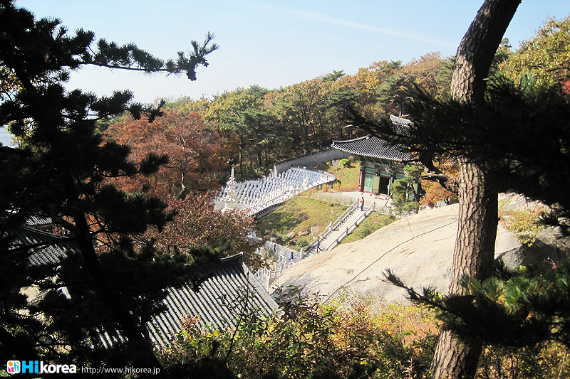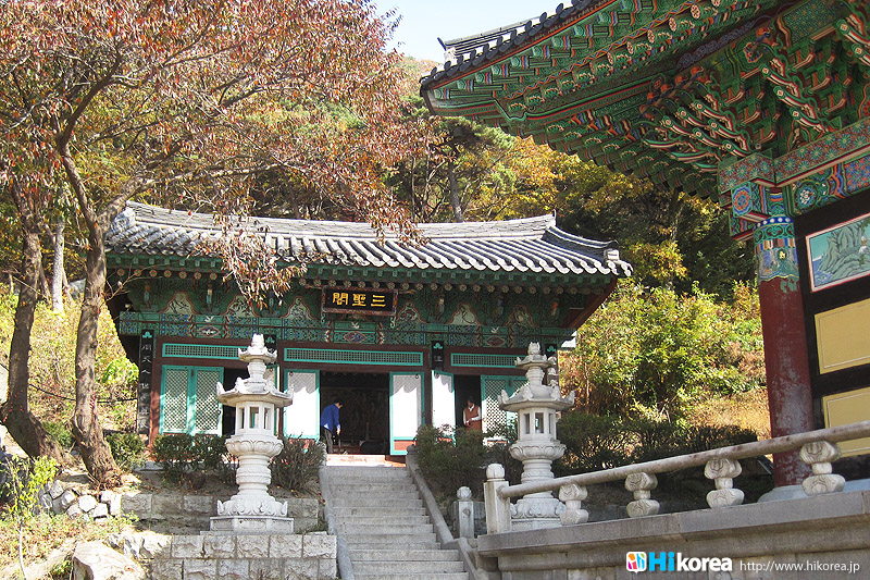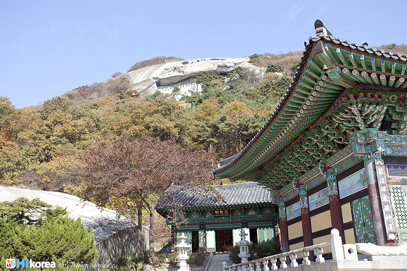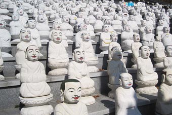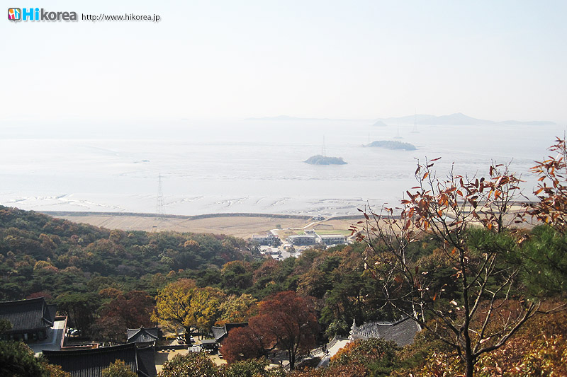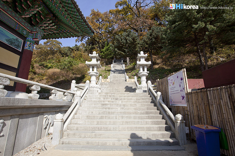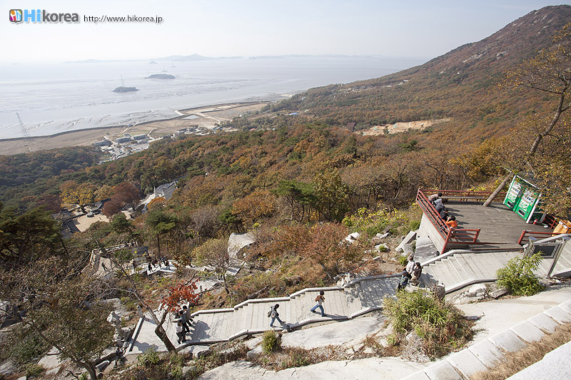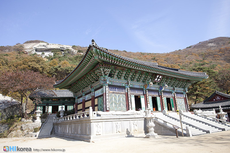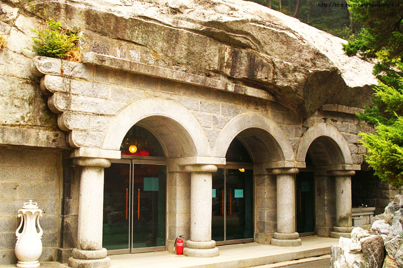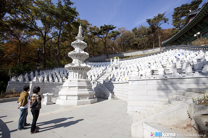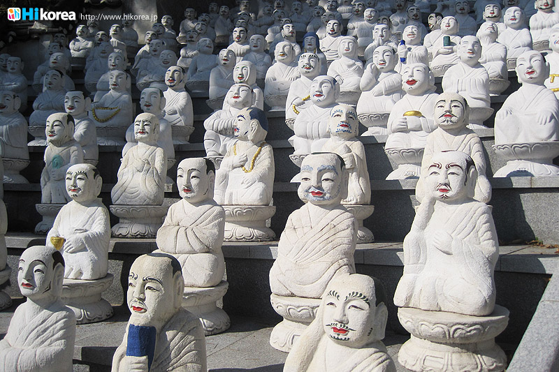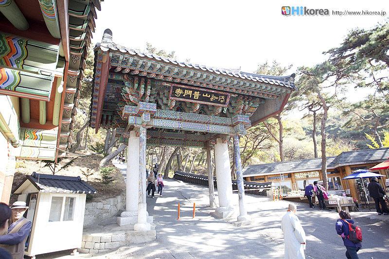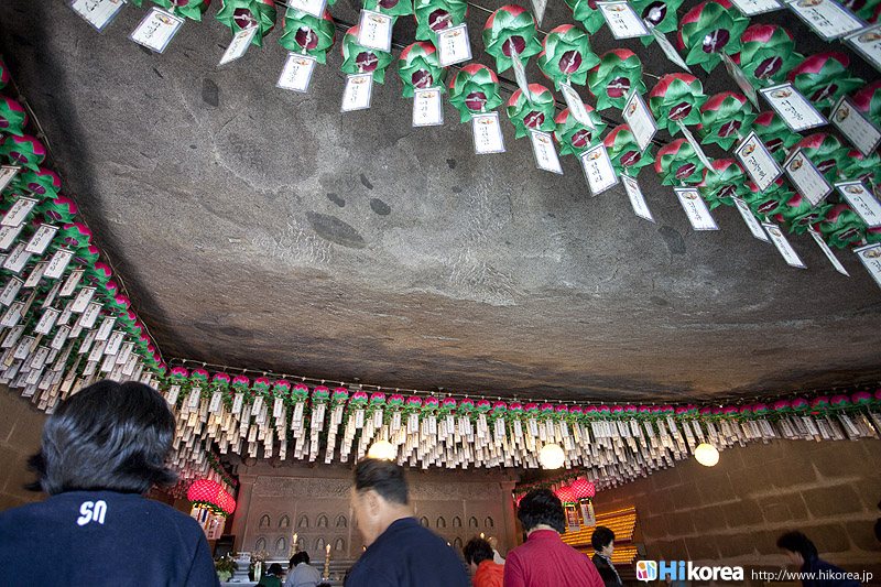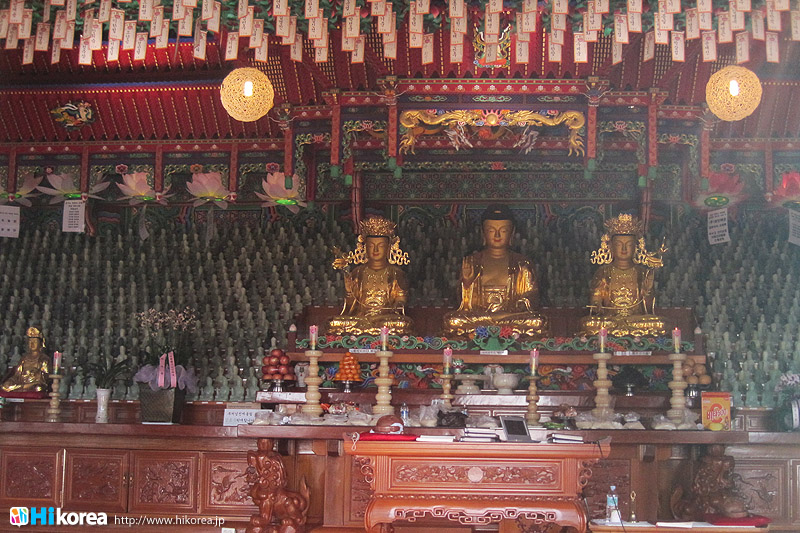江華島から船で西に約5分の席毛島の洛迦山の中腹にある「普門寺」は、襄陽洛山寺と錦山菩薩庵と共に韓国の三大祈祷院です。新羅時代の善徳女王4年(635)に犠正大師が金剛山(北朝鮮)で修行し、ここにやって来てお寺を創建したと伝えられています。漁夫の網にかかった仏像を並べて奉った石窟羅漢殿と、1928年に金剛山・表訓寺の住職(当時は日帝時代でまだ分断されていなかった)と普門寺の住職が、眉毛岩に彫刻したと言われる高さ9.2mの磨崖観音像が見所です。また、石窟内部にある由緒ある香木と、寺に従事する人々が使ったとされる巨大な石臼も見物で、海に沈む夕日も見逃せない景色のひとつです。夜の礼仏が始まる午後6時になると、僧侶たちが演奏する法鼓の音が響き渡り幻想的です。江華島の西の島・席毛島に位置上でも説明したように普門寺は、江華島の西側にある席毛島の洛迦山の中腹にあるお寺です。席毛島は、江華島の外浦里にある外浦乗船場からフェリーに乗って5分ほどの所に位置しています。そして、席毛島の船浦里乗船場から車で10分ほど走ると普門寺の門前に到着します。門前に到着すると洛迦山普門寺と書かれた門があり、そこから坂道を10分ほど登って行けば普門寺に到着します。そこには、極楽宝殿、石窟、三神ハルモニが奉られてる三聖閣などがあり、そしてまた400段ほどの階段を登れば、眉毛岩にある磨崖観音像にたどり着きます。そこまで行くのはちょっときついですが、眉毛岩から見渡す黄海は絶景で、またこの磨崖観音像にお祈りすれば必ず願いを叶えてくれると言うので、普門寺に行ったらぜひ眉毛岩まで登ってみましょう。 ![]() 伝説のある石窟普門寺の石窟には創建と関連した伝説があります。それは犠正大師が普門寺を創建してから14年目。普門寺のある洛迦山の麓に住むひとりの漁師が、ある日漁をしていると網に人の形をした大きな石ころが22個引っかかりました。漁師には必要のない物だったので、そのまま海に捨てたのですが、再び網に引っかかったので、もう一度それを捨てました。そして、その日の夜、漁師の夢の中に一人の年老いたお坊さんが現れました。お坊さんが“私が捨てた石は天竺の国から送られて来た貴重な仏像なので拾い上げて名山に安置してください。”と頼んだので、漁師は次の日もう一度海に行ってその石をすくい上げました。そして、それを綺麗に洗って夢に出てきた石窟に持って行きました。すると石窟には石像を安置するのにぴったりな天然の座台があったので、そこに石像を安置しました。また、石窟の横には霊験あらたかな泉が湧き出ていて、その味はあまく、たくさん飲み過ぎてもお腹をこわすことはなかったそうです。また最近石像を調査したのですが、この石像は韓国の花崗岩ではなく、インド産の石であることが確認されたと言います。石像の大きさは30cm前後で、仏壇の後ろには1982年の仏壇造成を記念する<普門寺石窟法堂縁起文>と<法華経略募掲>という文字が彫られています。 臥仏殿臥仏殿は五百羅漢と共に千人台に築造された殿閣です。築造当時お釈迦様の姿を自然石に、彫刻してお祭りしていて、全体の身長は10m、涅槃台は12mとなっています。また釈迦様の後ろには空間があり、周囲を回りながら参拝することもできます。お釈迦様の横になっている姿と手の様子、仏衣のひだなどが実写的に表現されていて、雲様が彫られた涅槃台は雲の形が秀でて美しく彫刻されています。 極楽宝殿普門寺の中心にある極楽宝殿は前面5間、側面3間で、中の広さは60坪で1972年静守和尚が修造しました。法堂の中の祭壇の上段にはお釈迦様と大勢至菩薩、観世音菩薩が祭られてあり、中段には地蔵菩薩と大勢至菩薩、観世音菩薩と神衆幀畫が、下段には霊駕壇が祭られています。また、上段の後ろ側には三千個の玉で作られたお釈迦様が祭られていて、三尊仏の上には仏蓋が作られ天井の方には左右にそれぞれ一つずつ龍が彫られています。そして、殿閣の門は彩られた花柄の桟で素朴な味わいをだしています。