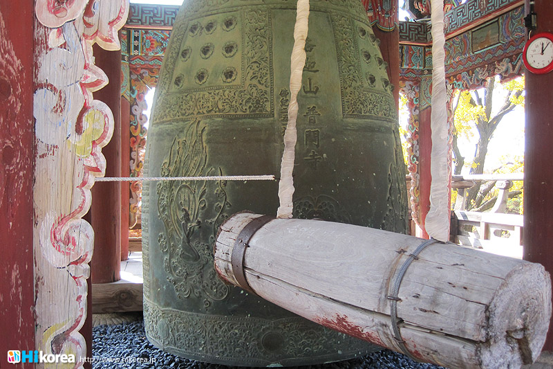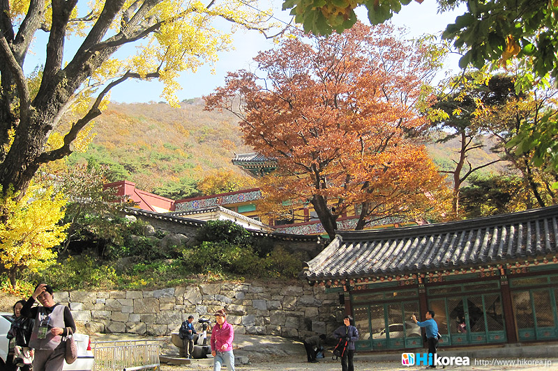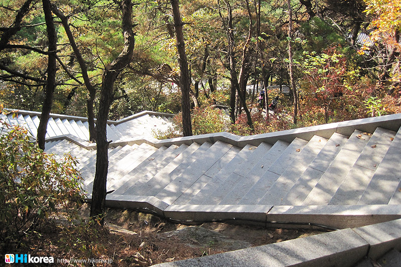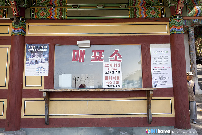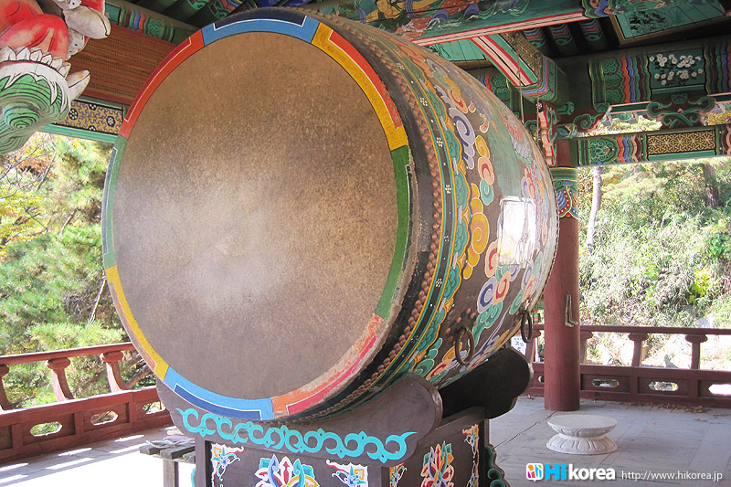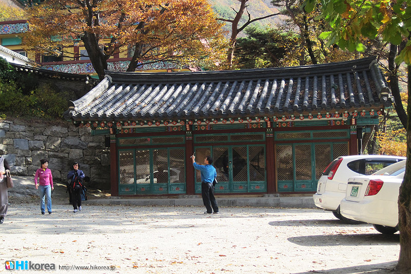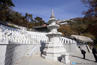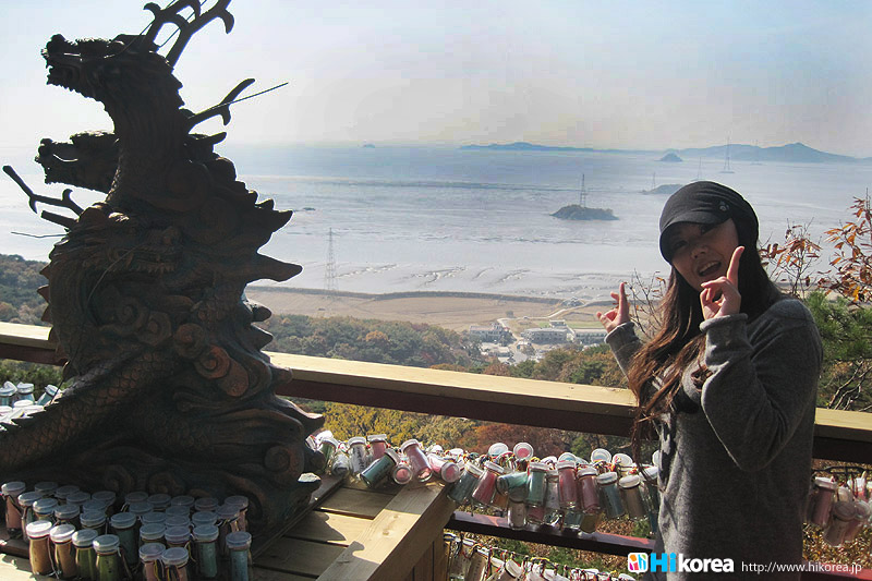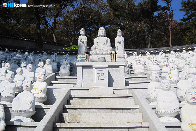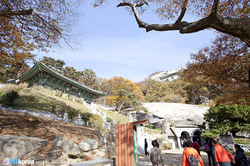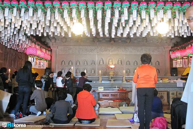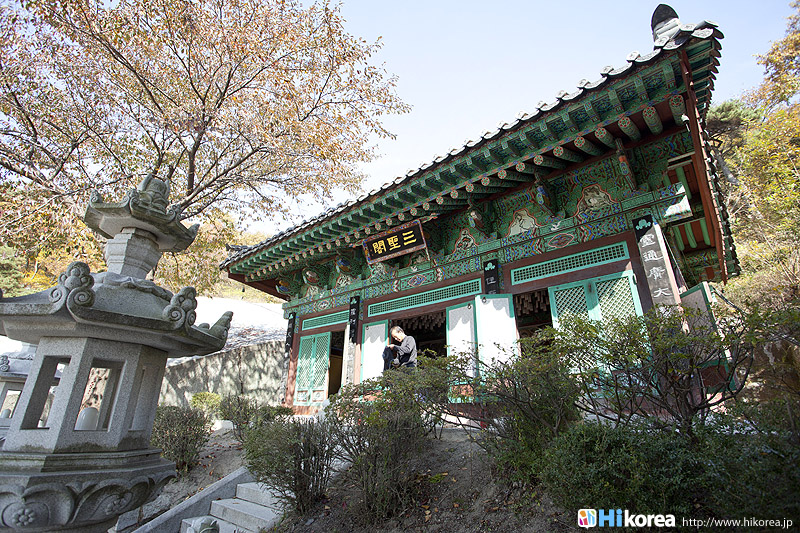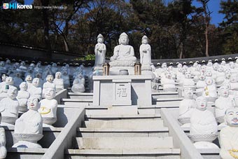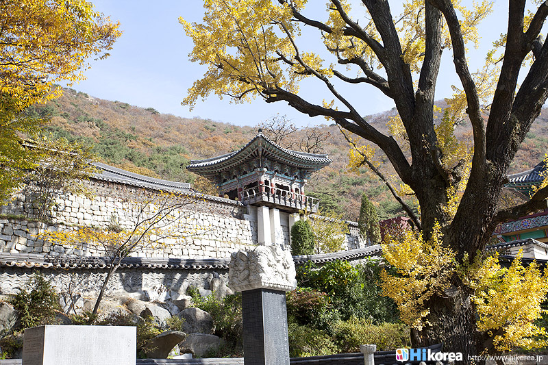 江華島から船で西に約5分の席毛島の洛迦山の中腹にある「普門寺」は、襄陽洛山寺と錦山菩薩庵と共に韓国の三大祈祷院です。新羅時代の善徳女王4年(635)に犠正大師が金剛山(北朝鮮)で修行し、ここにやって来てお寺を創建したと伝えられています。漁夫の網にかかった仏像を並べて奉った石窟羅漢殿と、1928年に金剛山・表訓寺の住職(当時は日帝時代でまだ分断されていなかった)と普門寺の住職が、眉毛岩に彫刻したと言われる高さ9.2mの磨崖観音像が見所です。また、石窟内部にある由緒ある香木と、寺に従事する人々が使ったとされる巨大な石臼も見物で、海に沈む夕日も見逃せない景色のひとつです。夜の礼仏が始まる午後6時になると、僧侶たちが演奏する法鼓の音が響き渡り幻想的です。江華島の西の島・席毛島に位置上でも説明したように普門寺は、江華島の西側にある席毛島の洛迦山の中腹にあるお寺です。席毛島は、江華島の外浦里にある外浦乗船場からフェリーに乗って5分ほどの所に位置しています。そして、席毛島の船浦里乗船場から車で10分ほど走ると普門寺の門前に到着します。門前に到着すると洛迦山普門寺と書かれた門があり、そこから坂道を10分ほど登って行けば普門寺に到着します。そこには、極楽宝殿、石窟、三神ハルモニが奉られてる三聖閣などがあり、そしてまた400段ほどの階段を登れば、眉毛岩にある磨崖観音像にたどり着きます。そこまで行くのはちょっときついですが、眉毛岩から見渡す黄海は絶景で、またこの磨崖観音像にお祈りすれば必ず願いを叶えてくれると言うので、普門寺に行ったらぜひ眉毛岩まで登ってみましょう。 ![]() 伝説のある石窟普門寺の石窟には創建と関連した伝説があります。それは犠正大師が普門寺を創建してから14年目。普門寺のある洛迦山の麓に住むひとりの漁師が、ある日漁をしていると網に人の形をした大きな石ころが22個引っかかりました。漁師には必要のない物だったので、そのまま海に捨てたのですが、再び網に引っかかったので、もう一度それを捨てました。そして、その日の夜、漁師の夢の中に一人の年老いたお坊さんが現れました。お坊さんが“私が捨てた石は天竺の国から送られて来た貴重な仏像なので拾い上げて名山に安置してください。”と頼んだので、漁師は次の日もう一度海に行ってその石をすくい上げました。そして、それを綺麗に洗って夢に出てきた石窟に持って行きました。すると石窟には石像を安置するのにぴったりな天然の座台があったので、そこに石像を安置しました。また、石窟の横には霊験あらたかな泉が湧き出ていて、その味はあまく、たくさん飲み過ぎてもお腹をこわすことはなかったそうです。また最近石像を調査したのですが、この石像は韓国の花崗岩ではなく、インド産の石であることが確認されたと言います。石像の大きさは30cm前後で、仏壇の後ろには1982年の仏壇造成を記念する<普門寺石窟法堂縁起文>と<法華経略募掲>という文字が彫られています。 臥仏殿臥仏殿は五百羅漢と共に千人台に築造された殿閣です。築造当時お釈迦様の姿を自然石に、彫刻してお祭りしていて、全体の身長は10m、涅槃台は12mとなっています。また釈迦様の後ろには空間があり、周囲を回りながら参拝することもできます。お釈迦様の横になっている姿と手の様子、仏衣のひだなどが実写的に表現されていて、雲様が彫られた涅槃台は雲の形が秀でて美しく彫刻されています。 極楽宝殿普門寺の中心にある極楽宝殿は前面5間、側面3間で、中の広さは60坪で1972年静守和尚が修造しました。法堂の中の祭壇の上段にはお釈迦様と大勢至菩薩、観世音菩薩が祭られてあり、中段には地蔵菩薩と大勢至菩薩、観世音菩薩と神衆幀畫が、下段には霊駕壇が祭られています。また、上段の後ろ側には三千個の玉で作られたお釈迦様が祭られていて、三尊仏の上には仏蓋が作られ天井の方には左右にそれぞれ一つずつ龍が彫られています。そして、殿閣の門は彩られた花柄の桟で素朴な味わいをだしています。