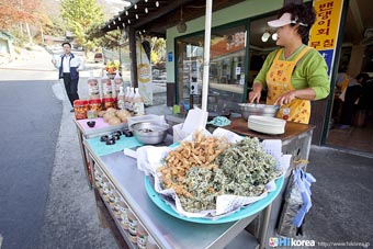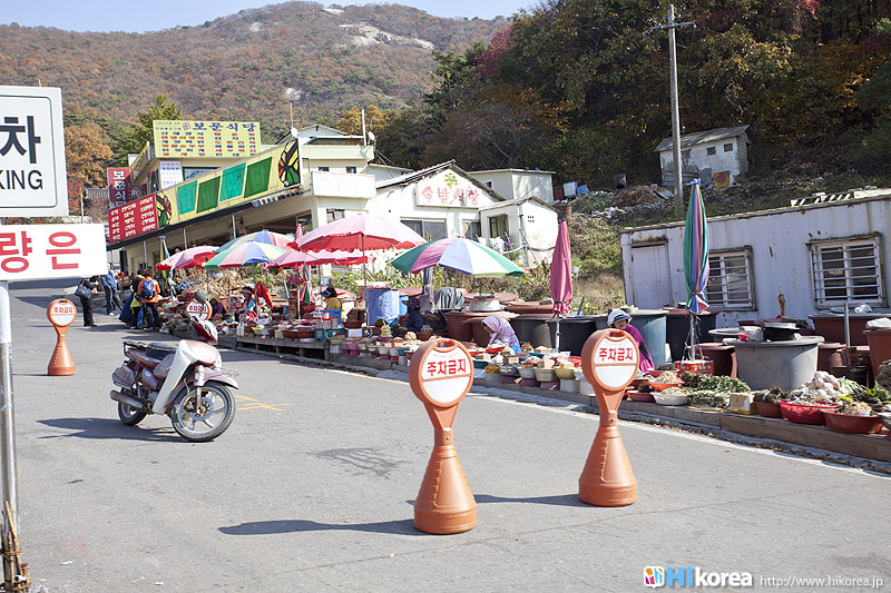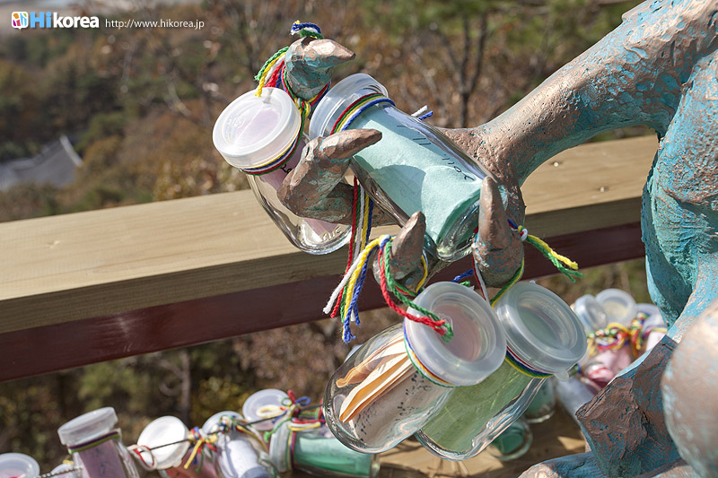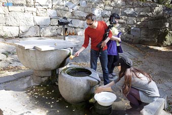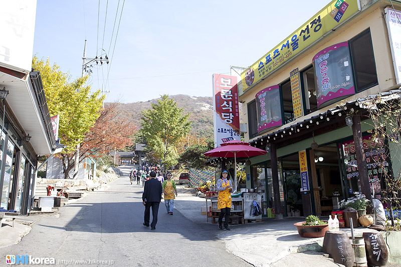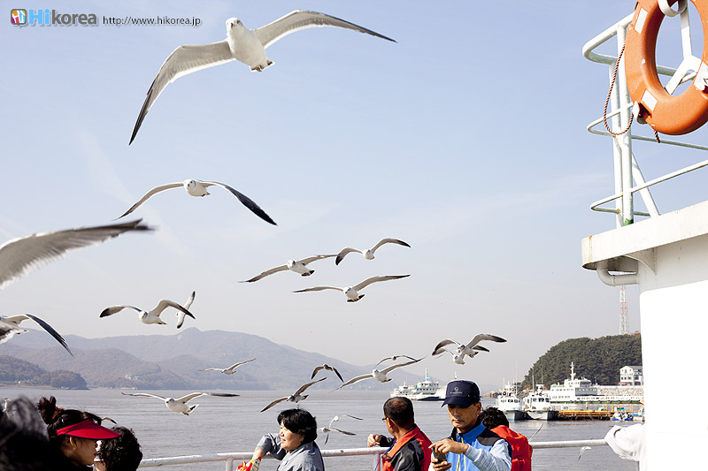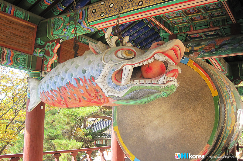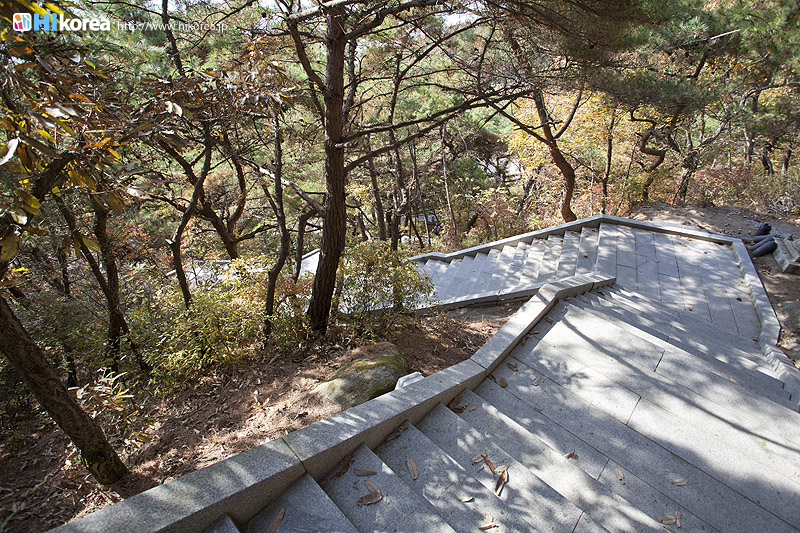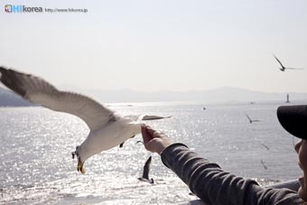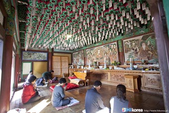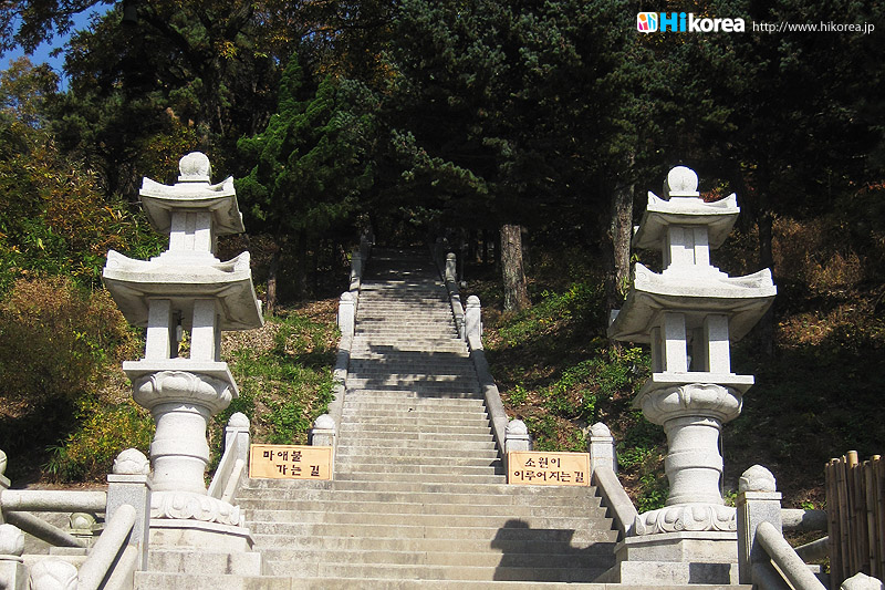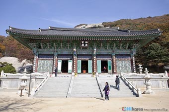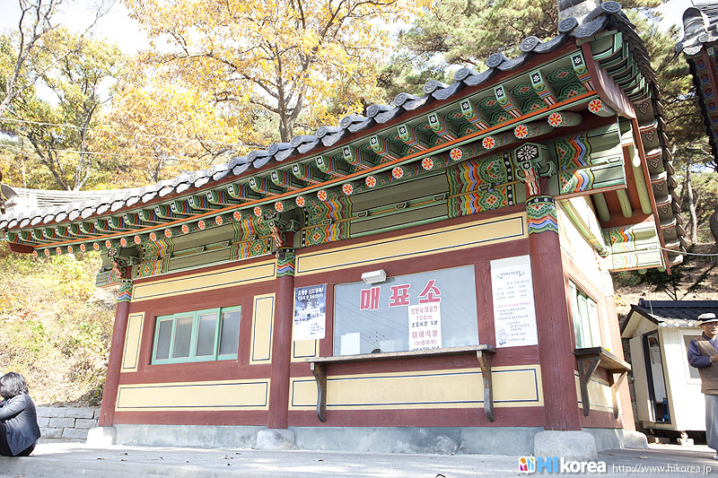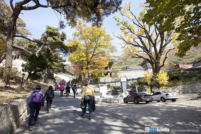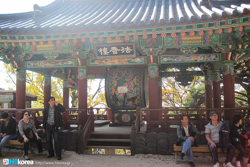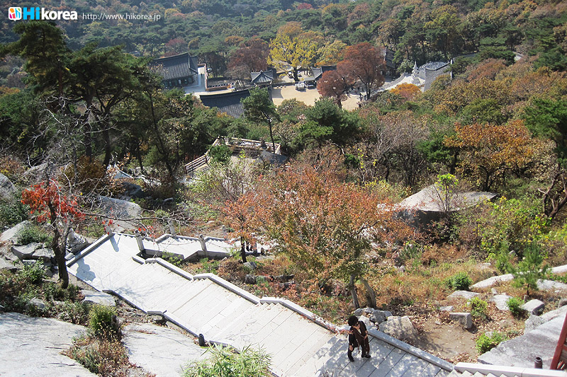 江華島から船で西に約5分の席毛島の洛迦山の中腹にある「普門寺」は、襄陽洛山寺と錦山菩薩庵と共に韓国の三大祈祷院です。新羅時代の善徳女王4年(635)に犠正大師が金剛山(北朝鮮)で修行し、ここにやって来てお寺を創建したと伝えられています。漁夫の網にかかった仏像を並べて奉った石窟羅漢殿と、1928年に金剛山・表訓寺の住職(当時は日帝時代でまだ分断されていなかった)と普門寺の住職が、眉毛岩に彫刻したと言われる高さ9.2mの磨崖観音像が見所です。また、石窟内部にある由緒ある香木と、寺に従事する人々が使ったとされる巨大な石臼も見物で、海に沈む夕日も見逃せない景色のひとつです。夜の礼仏が始まる午後6時になると、僧侶たちが演奏する法鼓の音が響き渡り幻想的です。江華島の西の島・席毛島に位置上でも説明したように普門寺は、江華島の西側にある席毛島の洛迦山の中腹にあるお寺です。席毛島は、江華島の外浦里にある外浦乗船場からフェリーに乗って5分ほどの所に位置しています。そして、席毛島の船浦里乗船場から車で10分ほど走ると普門寺の門前に到着します。門前に到着すると洛迦山普門寺と書かれた門があり、そこから坂道を10分ほど登って行けば普門寺に到着します。そこには、極楽宝殿、石窟、三神ハルモニが奉られてる三聖閣などがあり、そしてまた400段ほどの階段を登れば、眉毛岩にある磨崖観音像にたどり着きます。そこまで行くのはちょっときついですが、眉毛岩から見渡す黄海は絶景で、またこの磨崖観音像にお祈りすれば必ず願いを叶えてくれると言うので、普門寺に行ったらぜひ眉毛岩まで登ってみましょう。 ![]() 伝説のある石窟普門寺の石窟には創建と関連した伝説があります。それは犠正大師が普門寺を創建してから14年目。普門寺のある洛迦山の麓に住むひとりの漁師が、ある日漁をしていると網に人の形をした大きな石ころが22個引っかかりました。漁師には必要のない物だったので、そのまま海に捨てたのですが、再び網に引っかかったので、もう一度それを捨てました。そして、その日の夜、漁師の夢の中に一人の年老いたお坊さんが現れました。お坊さんが“私が捨てた石は天竺の国から送られて来た貴重な仏像なので拾い上げて名山に安置してください。”と頼んだので、漁師は次の日もう一度海に行ってその石をすくい上げました。そして、それを綺麗に洗って夢に出てきた石窟に持って行きました。すると石窟には石像を安置するのにぴったりな天然の座台があったので、そこに石像を安置しました。また、石窟の横には霊験あらたかな泉が湧き出ていて、その味はあまく、たくさん飲み過ぎてもお腹をこわすことはなかったそうです。また最近石像を調査したのですが、この石像は韓国の花崗岩ではなく、インド産の石であることが確認されたと言います。石像の大きさは30cm前後で、仏壇の後ろには1982年の仏壇造成を記念する<普門寺石窟法堂縁起文>と<法華経略募掲>という文字が彫られています。 臥仏殿臥仏殿は五百羅漢と共に千人台に築造された殿閣です。築造当時お釈迦様の姿を自然石に、彫刻してお祭りしていて、全体の身長は10m、涅槃台は12mとなっています。また釈迦様の後ろには空間があり、周囲を回りながら参拝することもできます。お釈迦様の横になっている姿と手の様子、仏衣のひだなどが実写的に表現されていて、雲様が彫られた涅槃台は雲の形が秀でて美しく彫刻されています。 極楽宝殿普門寺の中心にある極楽宝殿は前面5間、側面3間で、中の広さは60坪で1972年静守和尚が修造しました。法堂の中の祭壇の上段にはお釈迦様と大勢至菩薩、観世音菩薩が祭られてあり、中段には地蔵菩薩と大勢至菩薩、観世音菩薩と神衆幀畫が、下段には霊駕壇が祭られています。また、上段の後ろ側には三千個の玉で作られたお釈迦様が祭られていて、三尊仏の上には仏蓋が作られ天井の方には左右にそれぞれ一つずつ龍が彫られています。そして、殿閣の門は彩られた花柄の桟で素朴な味わいをだしています。