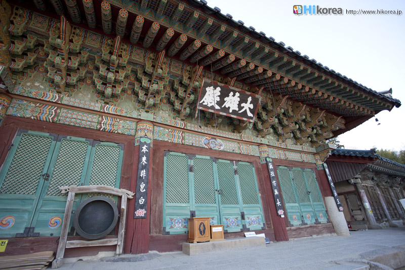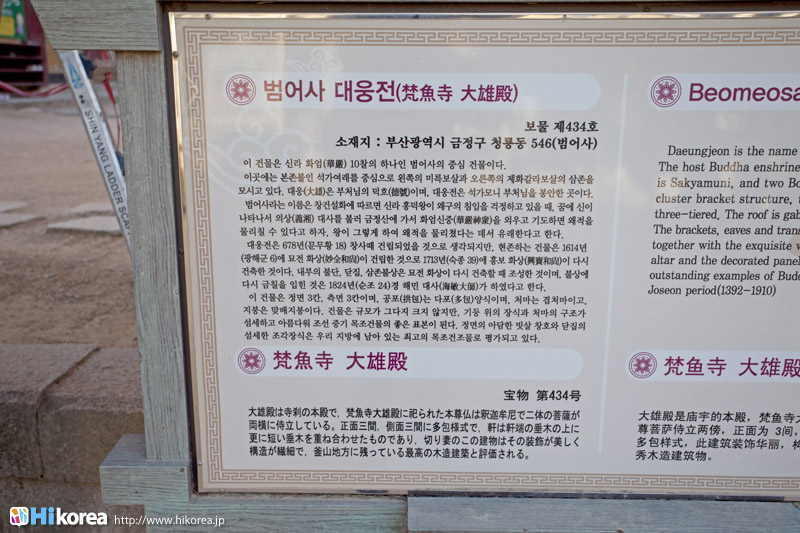 梵魚寺大雄殿に祀られた本尊仏は釈迦牟尼で2体の菩薩が両横に立っている様に祀られています。この建物は装飾がとても美しく、構造が繊細で釜山、又は釜山近郊に残っている最高の木造建物と評価されています。ここは重要文化財にあたる、