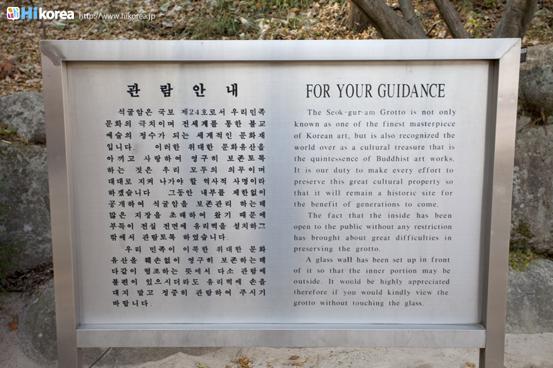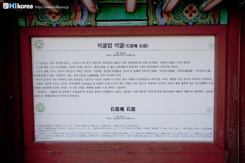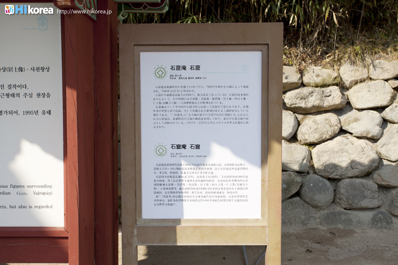 | アクセス方法案内 | 慶州駅または市外バスターミナルにてバス(10番、11番)乗車。仏国寺駐車場で下車後、石窟庵駐車場行きのバス(12番)に乗車 |