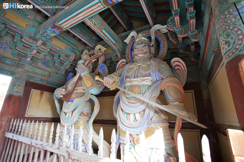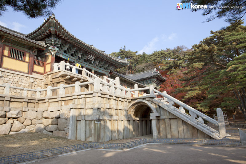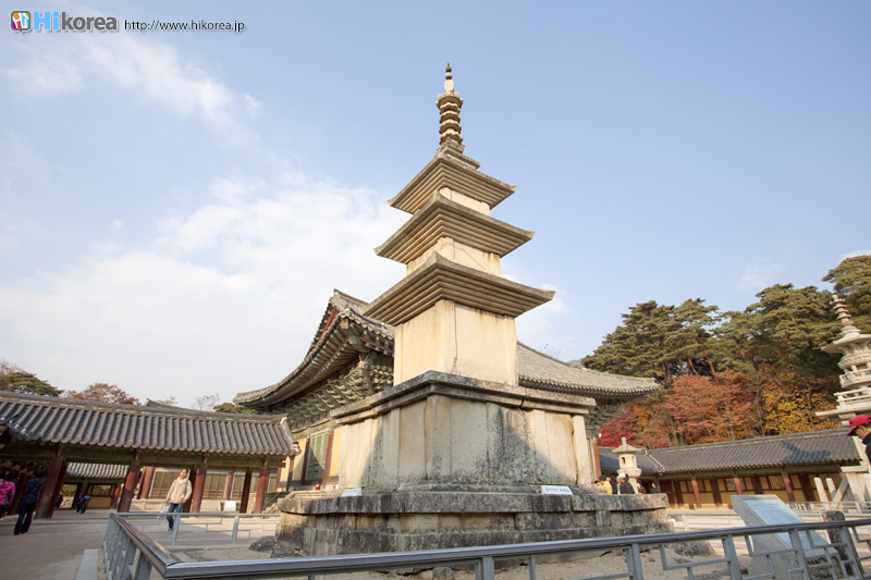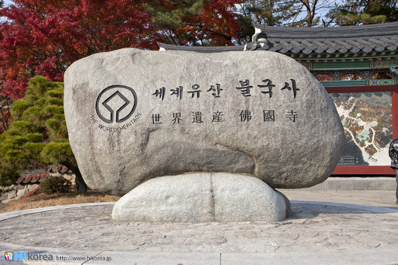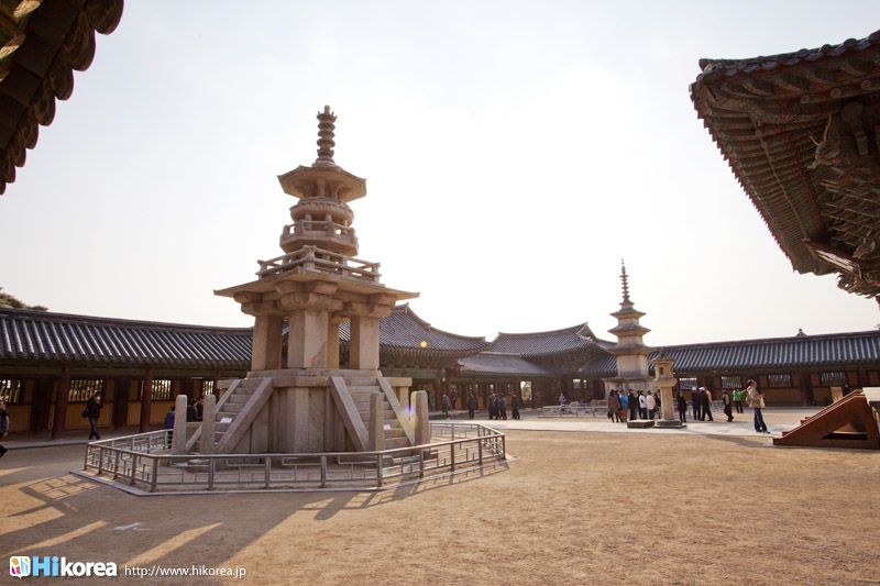 アンニョンハセヨ、ハイコリアです。皆さんご機嫌いかがですかヽ(*・ω・*)ノさて、今回ご紹介する場所は日本で言うと京都みたいな場所、慶州にある世界遺産『仏国寺』をご紹介致します。この『仏国寺』は大韓仏教曹渓宗第11教区の本寺であり、韓国を代表する寺院として広く知られています。創建の時期は様々な説がありますが、記録で一番古い仏国寺古今創記には西紀 528年(新羅法興王 15) 法興王のお母さん(迎帝夫人)の発願で仏国寺を創建されたという記録が残っています。その他様々な歴史や記録を残している『仏国寺』。仏教の教えからいうと、俗世を離れ清浄たる仏の世界に足を踏み入れる場所だそうです。街全体に貴重な文化財が多く残る慶州は見所が沢山あるにも関わらず、観光客達が必ずと言って良いほど足を運ぶのがここです。その知られざる歴史は一体なんでしょう。早速行ってみましょう。統一新羅時代に公認された仏教上にも書いたように仏国寺は西紀 528年(新羅法興王 15) 法興王のお母さん(迎帝夫人)の発願で仏国寺を創建し、その後 751年(景徳王 10)に金大城(キム・テソン)によって大きく改装されながら塔と石橋なども造ったと言われています。 その後約1000年に渡って繁栄を続けましたが、16世紀末に起こった文禄慶長の役で大半の焼失が焼失し、現在見ることの出来る仏国寺の姿は朝鮮時代後期、又1968年の発掘調査を踏まえて1973年に復元させたものです。 ここは仏様の世界である仏国土、つまり極楽浄土を現世に再現する事を目的として建設されたと言われています。仏教は、誕生初期の統一新羅において、人々の心をまとめるのに非常に重要な役割を果たしました。これによって人々に公認された仏教は『仏国寺』創建へと繋がって行ったのでした。最盛期には現在の10倍近い広さを誇っていたそうですよ。 早速中に入ってみると『불국사입구』(仏国寺入口)と書かれた看板があります。そのままずっと進んで行くと大きい岩が ありました。そこに書いてある文字を見てみると『世界遺産 仏国寺』と書かれていましたよ。ここで記念撮影をする方が多いようです。案内版もあり、韓国語・英語・中国語・日本語の説明が書かれていました。世界各国から観光客が訪れているのがうかがえますね。 入口の門構えには大きく漢字で『佛国寺』と書かれています。 上記にも記しましたが、ここは仏教の教えから言うと俗世を離れた清浄たる仏の世界に足を踏み入れる場所でもあるそうです。 『仏国寺』の中はとっても広く、庭や池などがあります。夏は青々とした草木の香り、秋は美しい紅葉が見られますよ。 空気が綺麗なので空も澄んでいますから、気分も良くなるはずです。歩いていくとさっきとは違う門がありますね・・・。 天王門という所に入ると、両サイドに4体の鬼!?と思ったら四天王の像が(>▽<;; ビ、ビックリなんてしてないです・・・ハイ。 橋内に入るとまず見えてくるのは紫霞門です。紫霞門に向かう階段は青雲橋(下段)と白雲橋(上段)という二段形式の階段(国宝第23号)で創建時より存在していたとし、橋下の俗世と橋の上にある彼岸世界(大雄殿)を繋ぐ役割を果たしてるといいます。その他蓮華橋と七宝橋があり、これは大雄殿の西の方に位置した極楽殿領域を上がる石造階段で国宝第22号に指定されています。様式は青雲橋、白雲橋の様ですが規模面でちょっと差があり、蓮華橋は高さ 230cm 幅 148cmで, 七宝橋は高さ 406cm, 幅 116cmです。階段に蓮の花びらが刻まれている部分を蓮華橋だとし、七宝橋は金 ・ 銀 ・ ユリ ・ 水晶 ・ 珊瑚 ・ 瑪瑙 ・ カボチャの橋として名前が由来します。これら階段は安養門まで繋がれていて、門を立ち入れば阿彌陀仏様の極楽世界である極楽殿領域に至るようになっています。階段は上段16段、下段17段の計33段からなりますが、33という数字は仏教において「未だ釈迦の境地に達していない」事を意味し、橋は悟りへ達しようとする「希望」の象徴でもあります。安養門に向かう階段は連華橋(下段)と七宝橋(上段)で極楽世界への悟りを開いた者だけが利用できる橋と伝えられています。 凛と建つ姿は見とれる程 階段の上から見た様子 良く見ると模様が細かくキレイ 隅々まで管理されている境内は心のままに見て回れます。 彼岸世界(大雄殿)には多宝塔(国宝第20号)と三層石塔(別名:釈迦塔 国宝第21号)があります。 三層石塔は三国時代の石塔で隣の多宝塔とは違い、当時の伝統的な石塔様式を取っています。塔の元々名前は『釈迦如来常住設法塔』で“釈迦塔”と呼ばれます。 釈迦仏様と仏様の教化を象徴する塔で高さは 8m 20cmで751年に建てられました。また釈迦塔は以前に建てられた感恩寺跡3層石塔の形態を受け継いだ3階石塔の典型だと言えます。 塔の周りに配置されている八個の蓮の花はここの聖域を現わします。塔内で発見された世界最初の木刷り物である、無垢浄光大陀羅尼経など 70 点程の文化財はまとめて国際第 126号に指定されています。 多