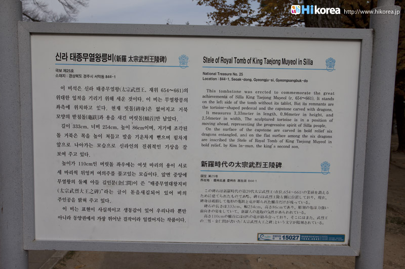 | アクセス方法案内 | 慶州駅、バスターミナルから300番バスに乗り武烈王陵にて下車 |
