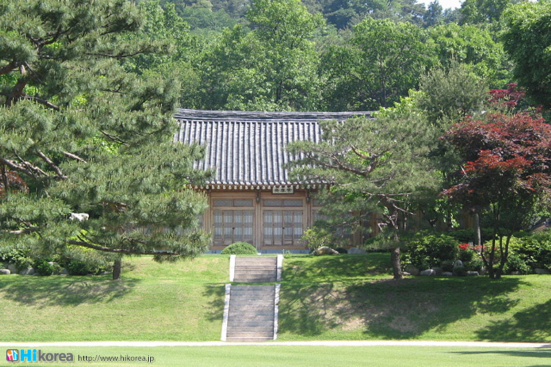 この青瓦は陶器と同じ製作過程を通過して、一枚一枚作られるため非常に貴重で、しかも頑丈に出来ているので、100年は悠々と耐える強度が特徴で、この青瓦がここでは15万枚以上が使用されています。その青さが一番美しく見える八作構造の建物になっており、韓国国民の誇りと自信が表されています。