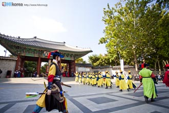 朝鮮時代守門将は、都を守る城郭にある門や景福宮や徳寿宮などの国王が生活する王宮の門を守る責任者でした。厳格な手順で守門将は勤務を交代することによって王室や国家を守っていました。そんな 守門将交代儀式を徳寿宮では、忠実に再現したものを見る事ができます。儀式の説明を 韓国語、 英語、 日本語、 中国語に通訳して話てくれるので安心して聞けます。まず、徳寿宮では、始まりの大太鼓の合図は横のブースで無料の韓服体験をした観光客の人の中から選ばれます。太鼓の合図でラッパ、チャルメラ、太鼓、シンバル、鐘を持った音楽隊の演奏に合わせて旗を持った守門将が入場して来、続いて音楽隊、最後に槍を持った守門将が入場してきて一旦整列します。ここからが交代の儀式のはじまりです。まず各守門将が軍号(暗号)でお互いの身分確認をし、王宮門の鍵が入ってる保管箱の引継ぎをします。その次に符信と言う王宮門開閉の証票を合わせて命令の真偽を確認する事と巡将牌と言われる守門将であることを表す身分確認用の牌を引き継ぎます。これで交代儀式は終わりです。このあと音楽隊の演奏に合わせて11時の公演のあとは、清渓川を通って普信閣まで行進し、15時半の公演のあとは世宗路を通って光化門広場まで行進して行きます。この守門将交代儀式は徳寿宮の休館日の月曜日を除き毎日 11時、 14時、 15時30分と 1日3回公演しています。但し、雨天時と酷暑時、酷寒時には休演になるので気をつけてくださいね。